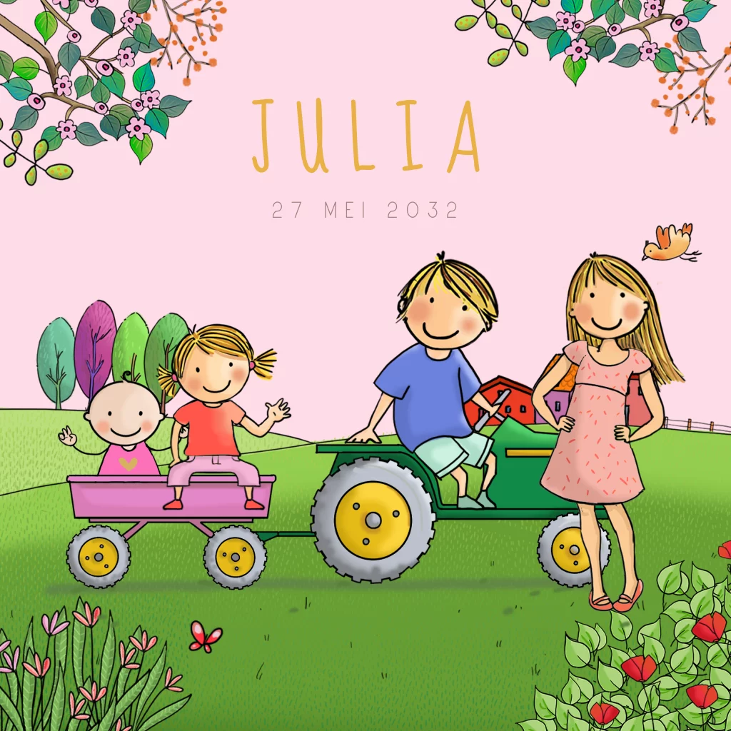 Kleurrijk geboortekaartje met stoere tractor groen met roze aanhangwagen, broer rijdt de trekker en broertje met baby meisje zit in de roze aanhanger. Grote zus staat er stoer bij.