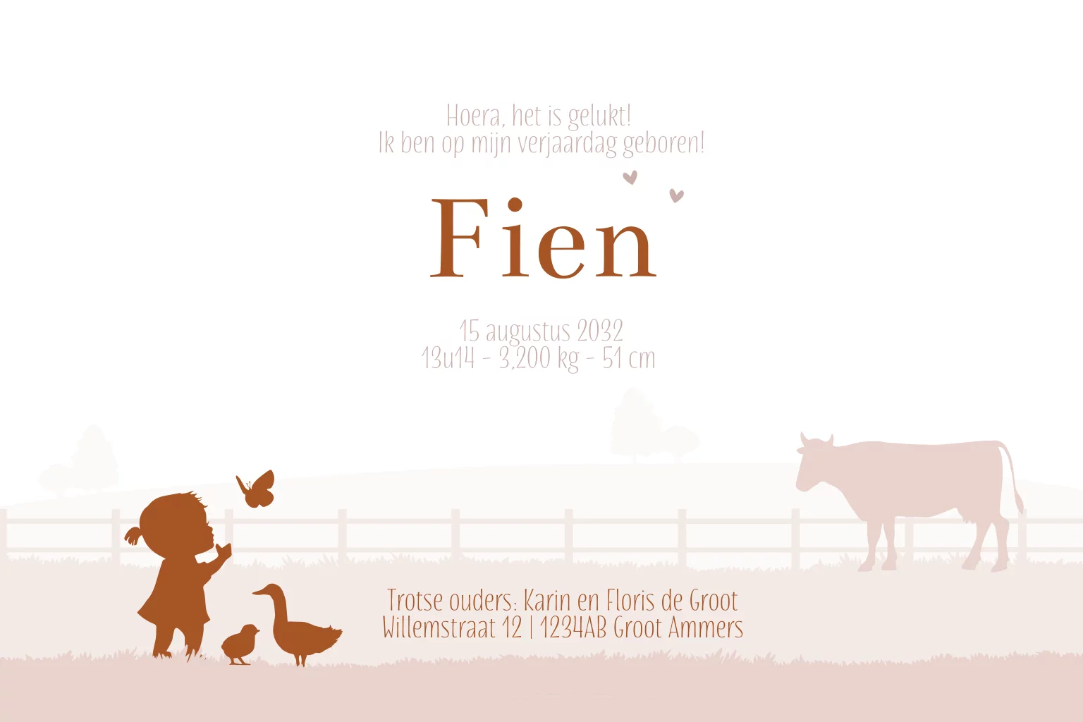Mooi in losse lagen geboortekaartje van meisje en zus en broertje op trekker met aanhangwagen, in de aanhangwagen zit een lief varkentje. Achtergrond heeft een prachtige boerderij met boom.