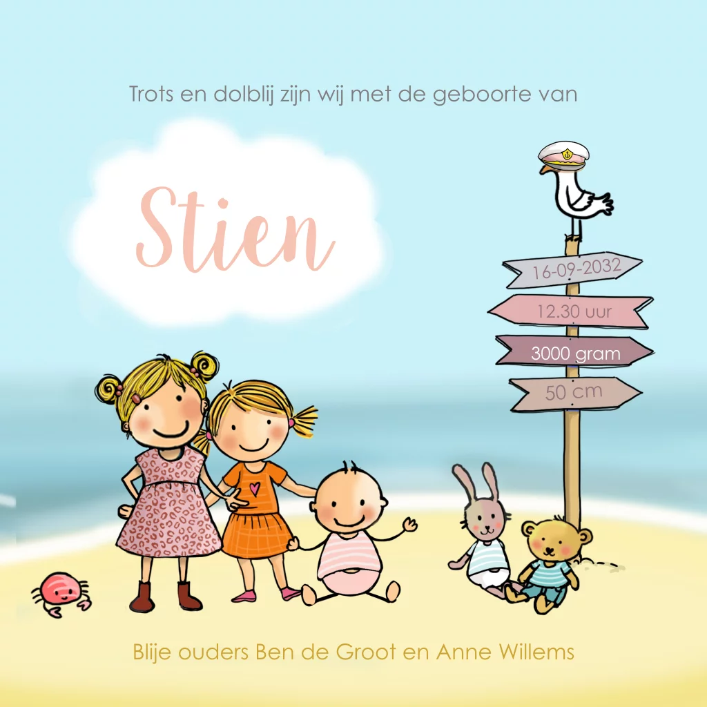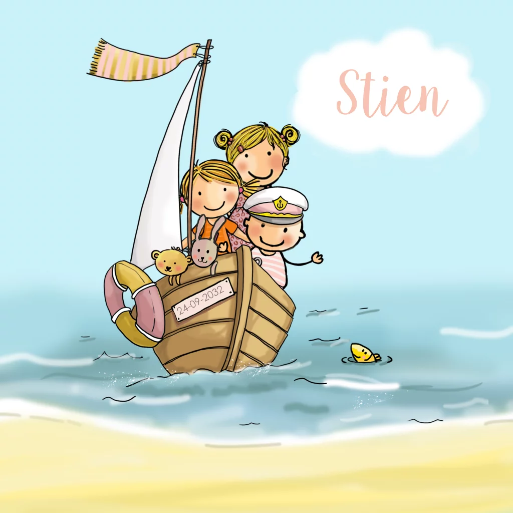 Geboortekaartje meisje in bootje met zusjes, mooi geïllustreerd kaartje van zee met boot en vissen. De afbeeldingen zijn los, uit de clipart kun je je kaart zelf samenstellen.