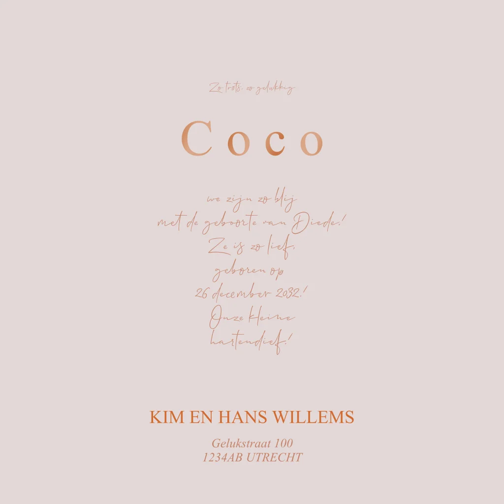 Geboortekaartje meisje met ouders en woonhuis