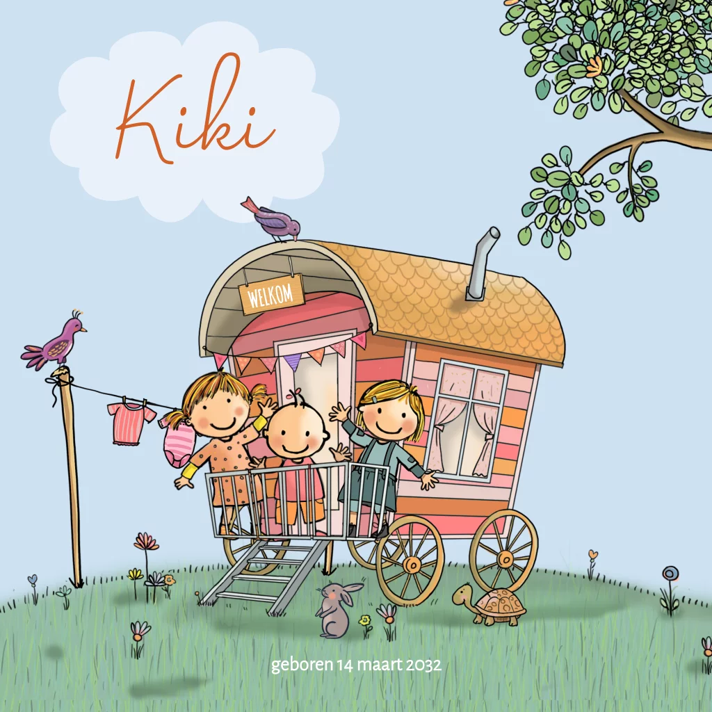 Geboortekaartje meisje pipowagen met zusjes vlaggetjes