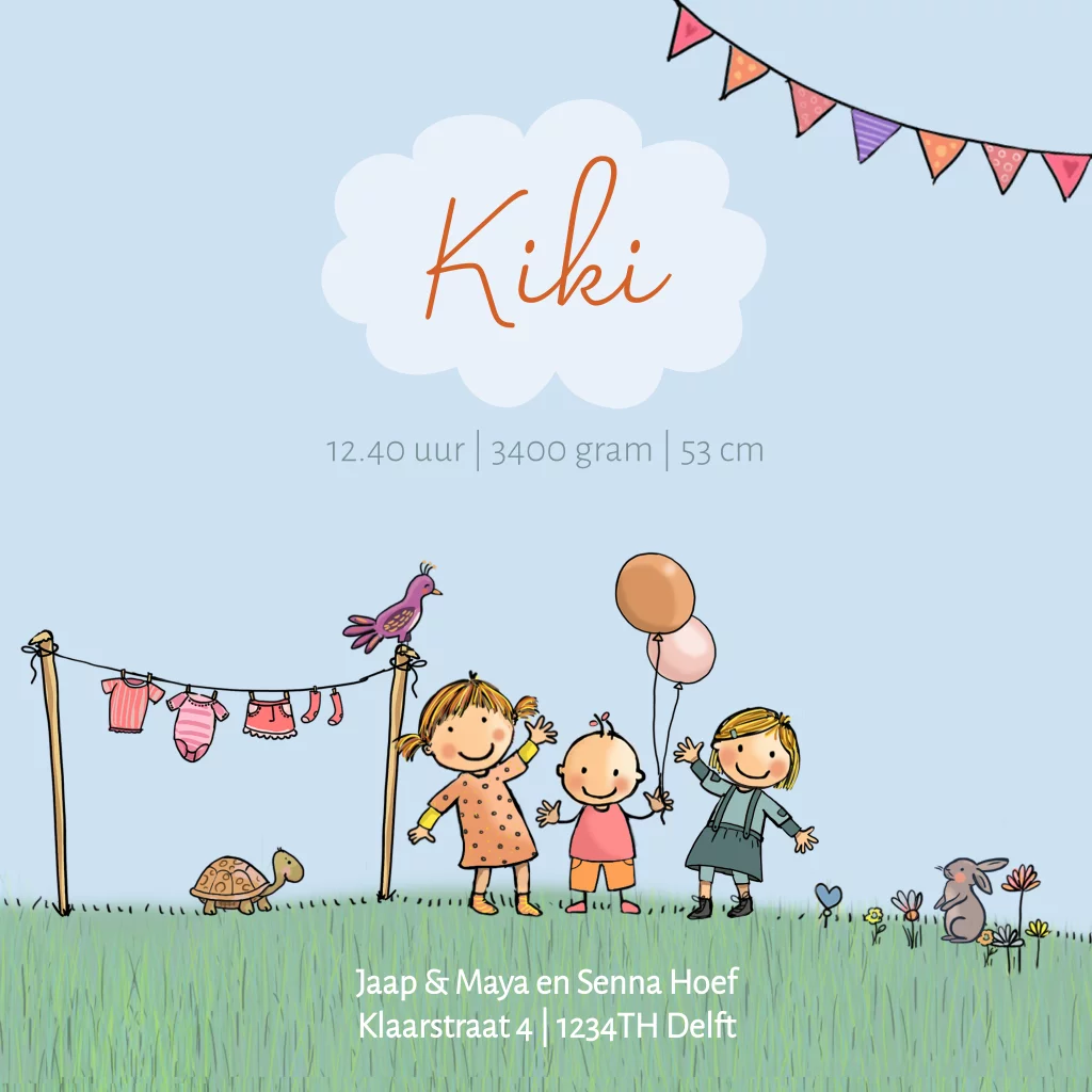 Geboortekaartje meisje pipowagen met zusjes en vlaggetjes, mooie achtergrond in blauw en groen gras. Teksten zijn naar wens aanpasbaar.