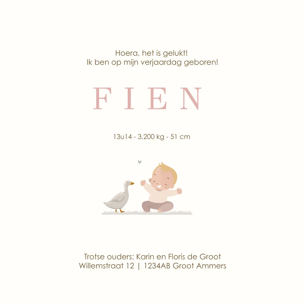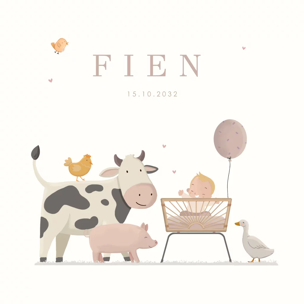 Handgetekend geboortekaartje meisje rotan wieg met boerderij dieren zoals een koe, varken, kip en vogel.