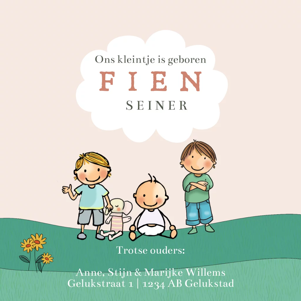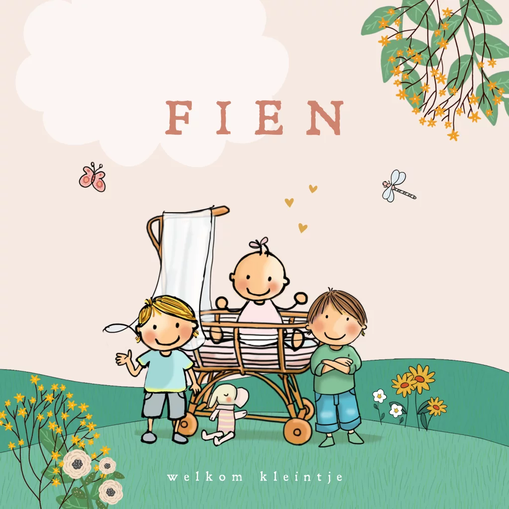 Geboortekaartje meisje rotan wiegje en broertjes met natuur