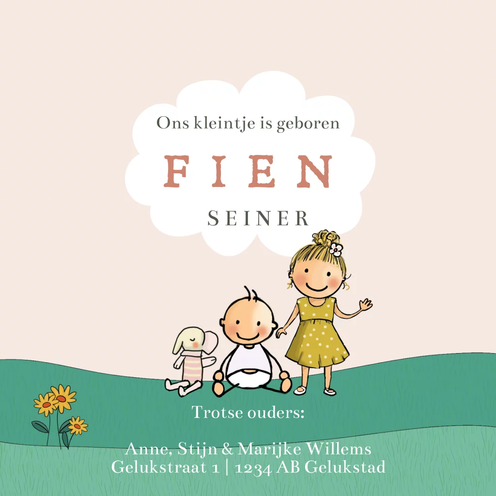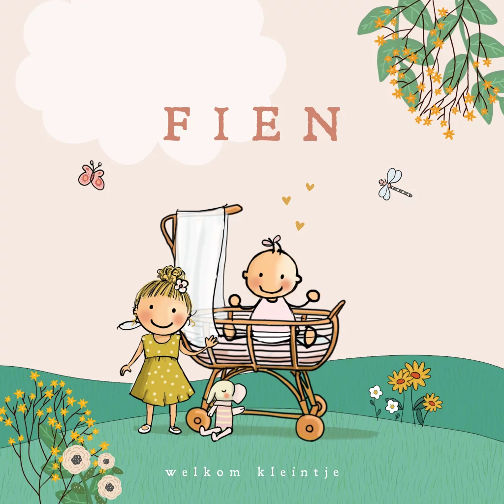 Geboortekaartje meisje rotan wiegje en zusje met natuur