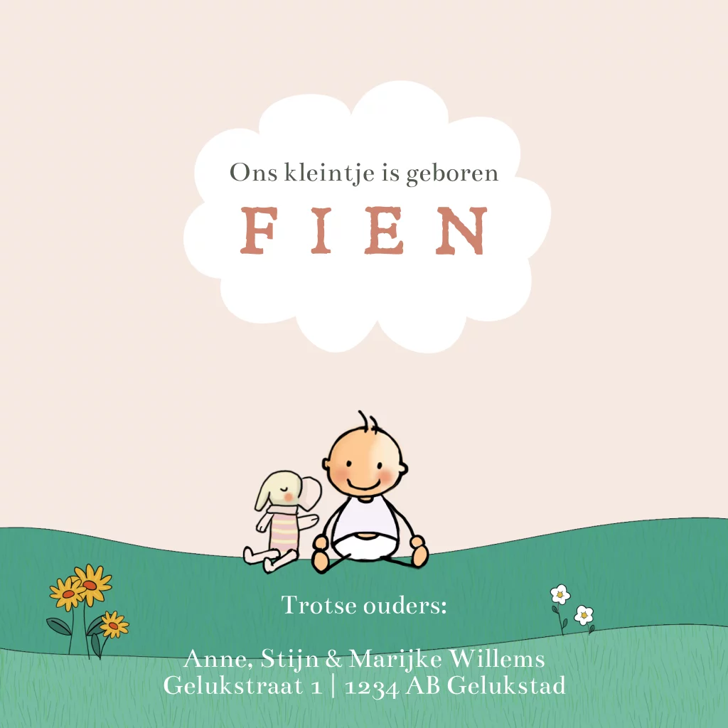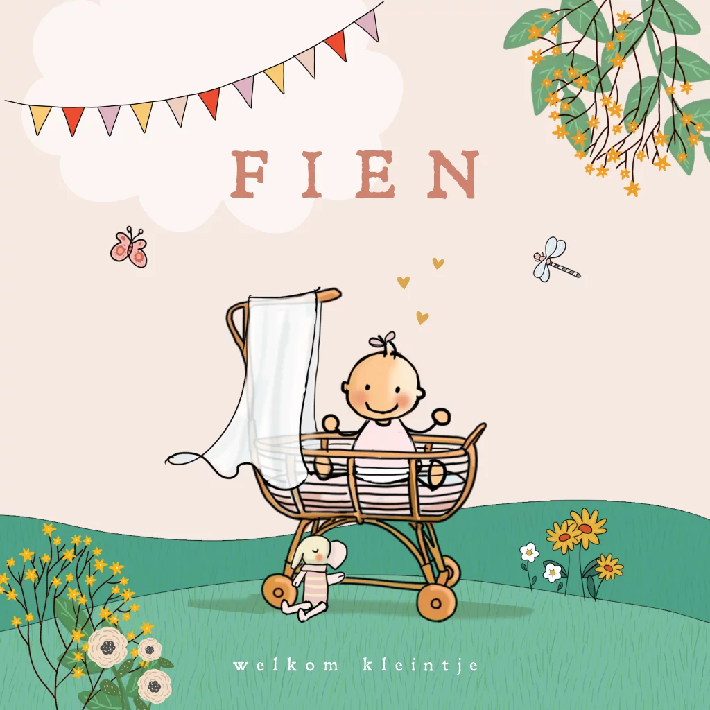 Geboortekaartje meisje rotan wiegje met natuur, vlinder, libelle en vele bloemen zorgen voor een vrolijke kaart.
