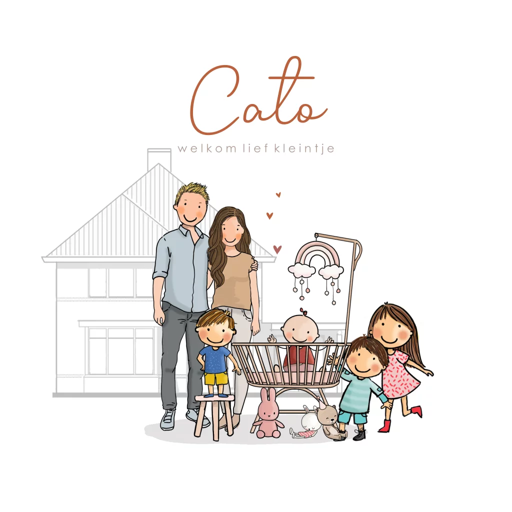 Geboortekaartje meisje rotan wiegje met ouders broertjes