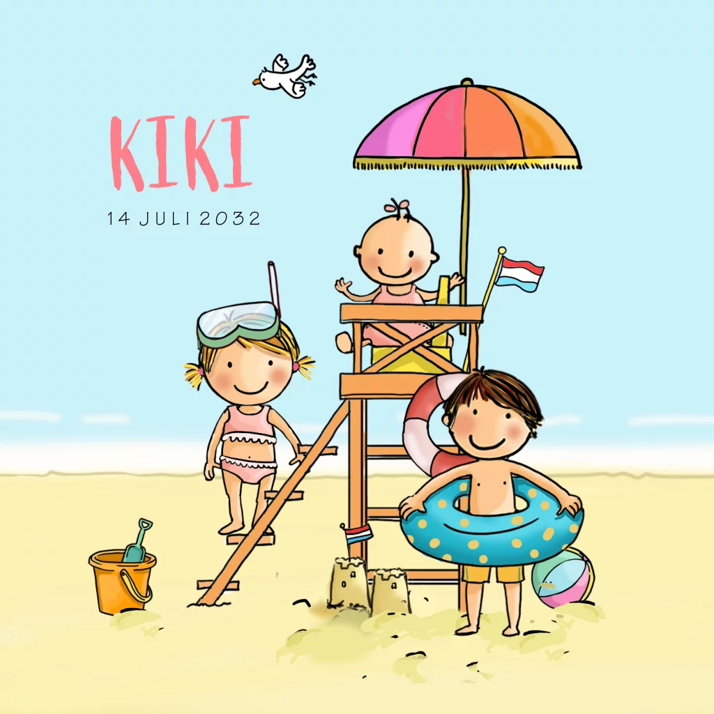 Geboortekaartje meisje strand uitkijkstoel zusje en broer