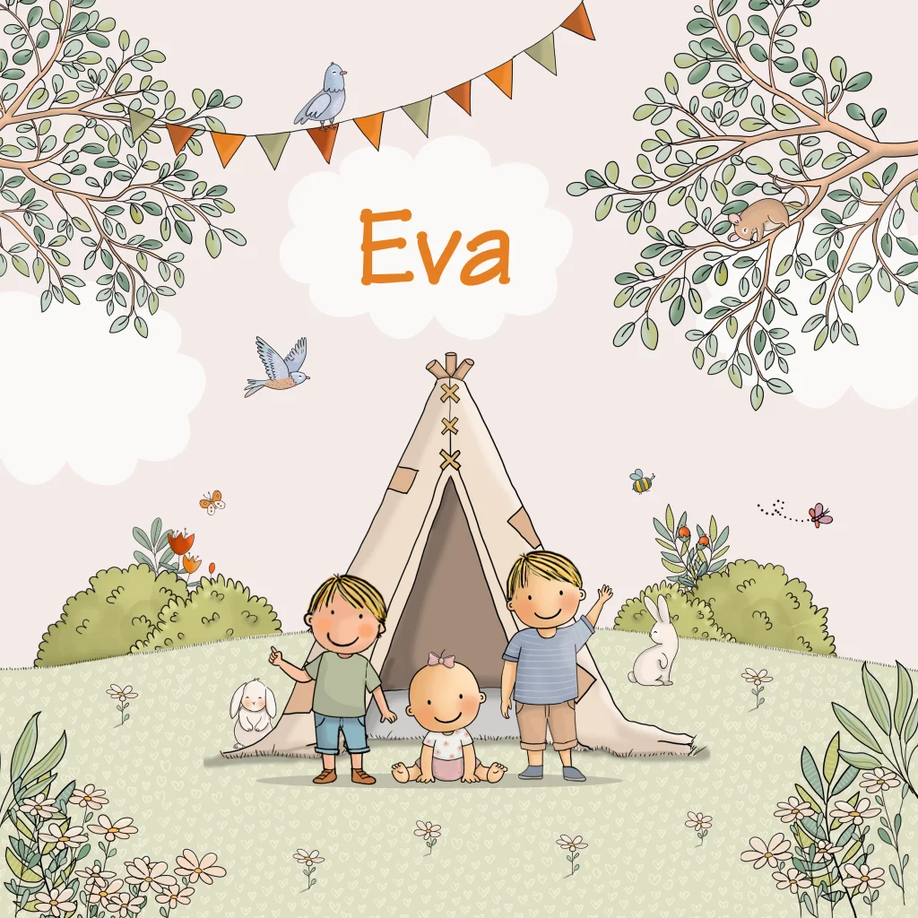 Geboortekaartje baby meisje met tent en broertjes. Dit unieke kaartje is perfect voor gezinnen die hun nieuwe toevoeging willen vieren, terwijl ze ook de liefde en betrokkenheid van de grote zus willen benadrukken. Mocht je een andere samenstelling willen, mail ons. We helpen graag.