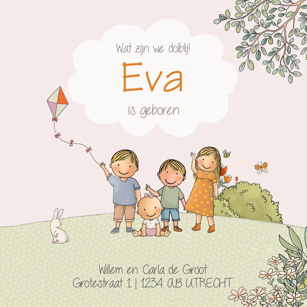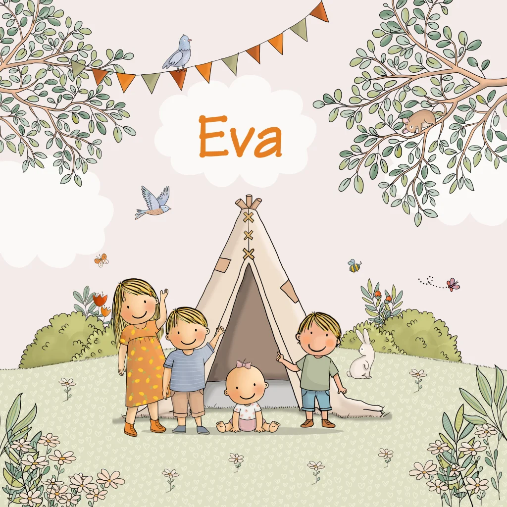 Geboortekaartje baby meisje met tent en broertjes en een grote zus. Dit unieke kaartje is perfect voor gezinnen die hun nieuwe toevoeging willen vieren, terwijl ze ook de liefde en betrokkenheid van de grote zus willen benadrukken. Het vierde kindje. Mocht je een andere samenstelling willen, mail ons. We helpen graag.