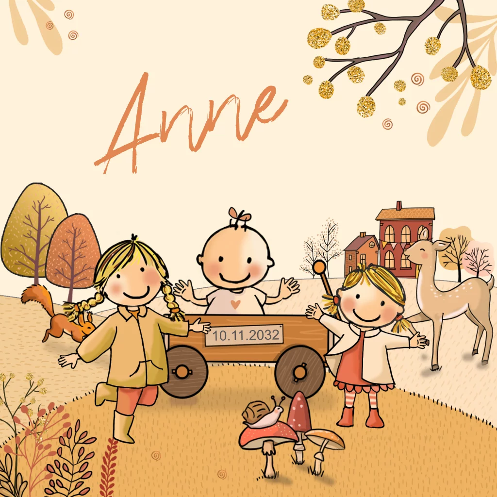 Prachtig geillustreerd geboortekaartje van een meisje en zusjes in kar met herfst achtergrond. Lieve bosdieren zijn toegevoegd zoals een eekhoorn, ree, slak en egeltje.