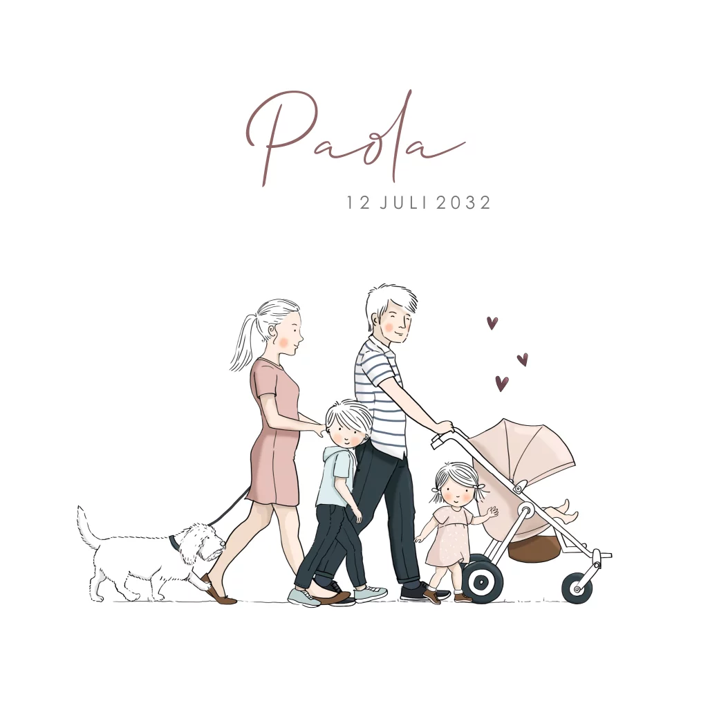 Geboortekaartje ouders met buggy en baby meisje met grote broer en zusje. Je kunt deze kaart naar wens samenstellen met de illustraties uit de clipart.