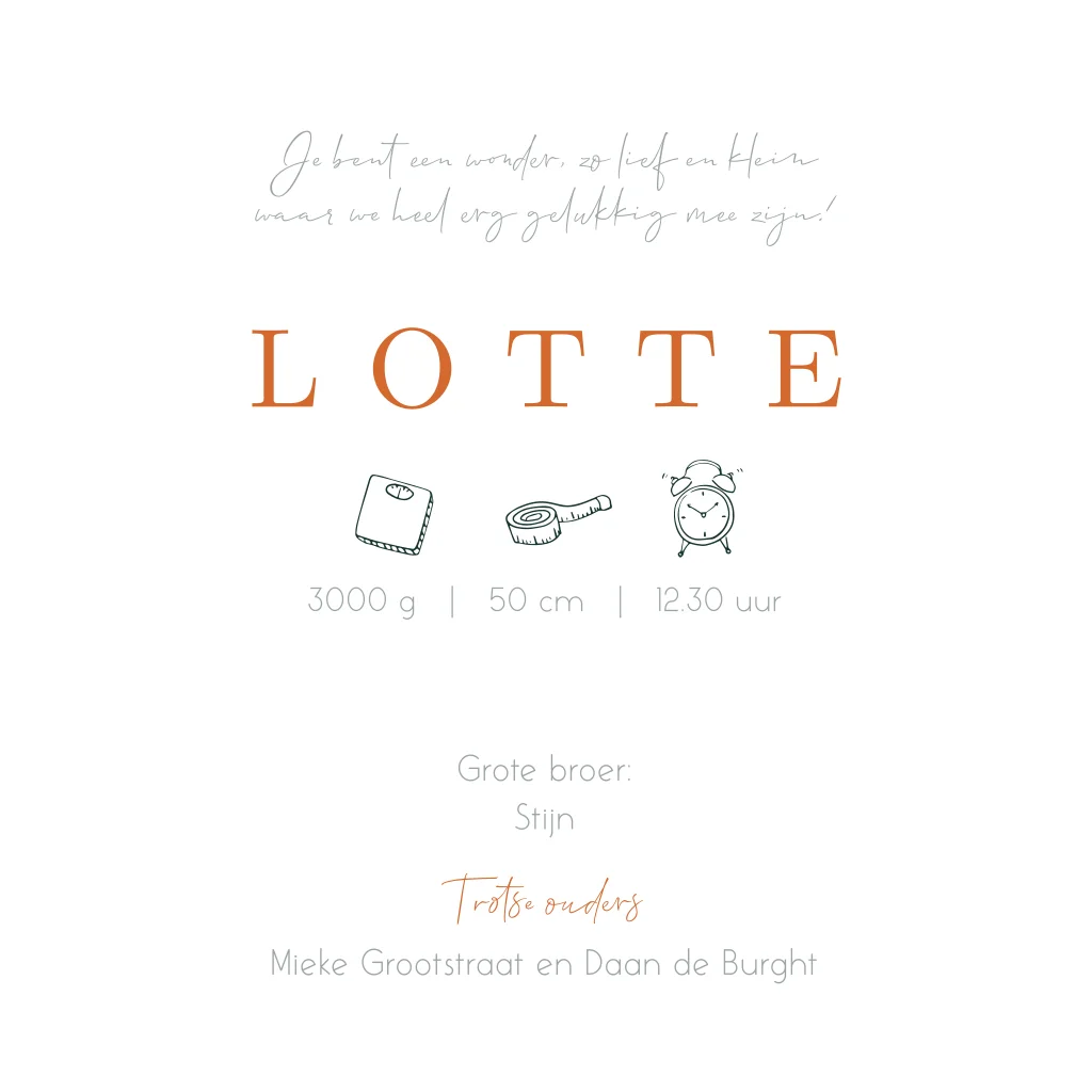 Geboortekaartje baby meisje met loopkar aanhanger grijs en koperfolie en hartjes. Een super lief kaartje met knuffel giraf, konijn en ballon in de aanhanger. Hartjes maken het af.