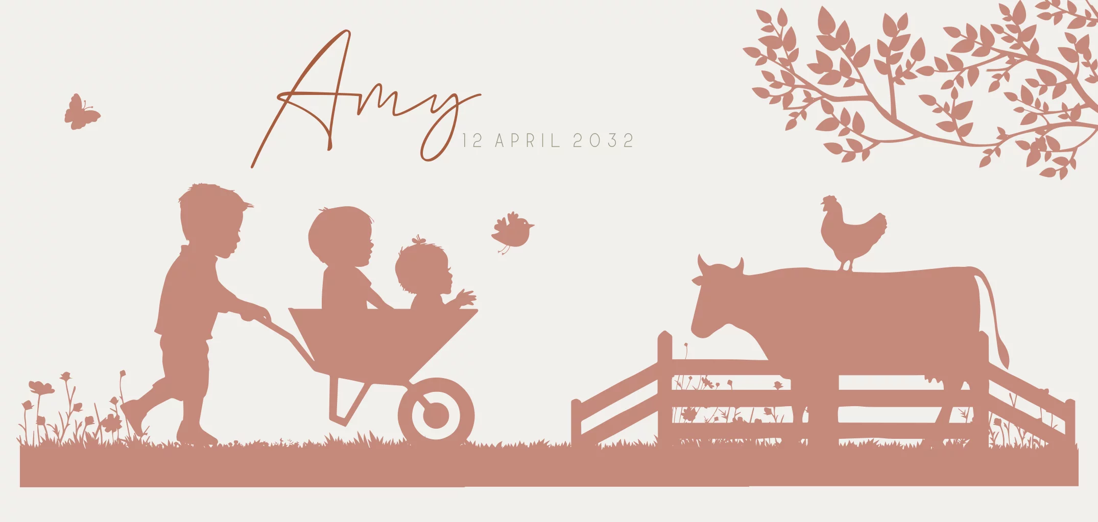 Geboortekaartje silhouette meisje in kruiwagen met broertjes, leuk hekje met koe en kip, vogels en vlinders vliegen rond. De kaart is naar wens aanpasbaar. Je kunt uit de clipart andere samenstellingen maken.