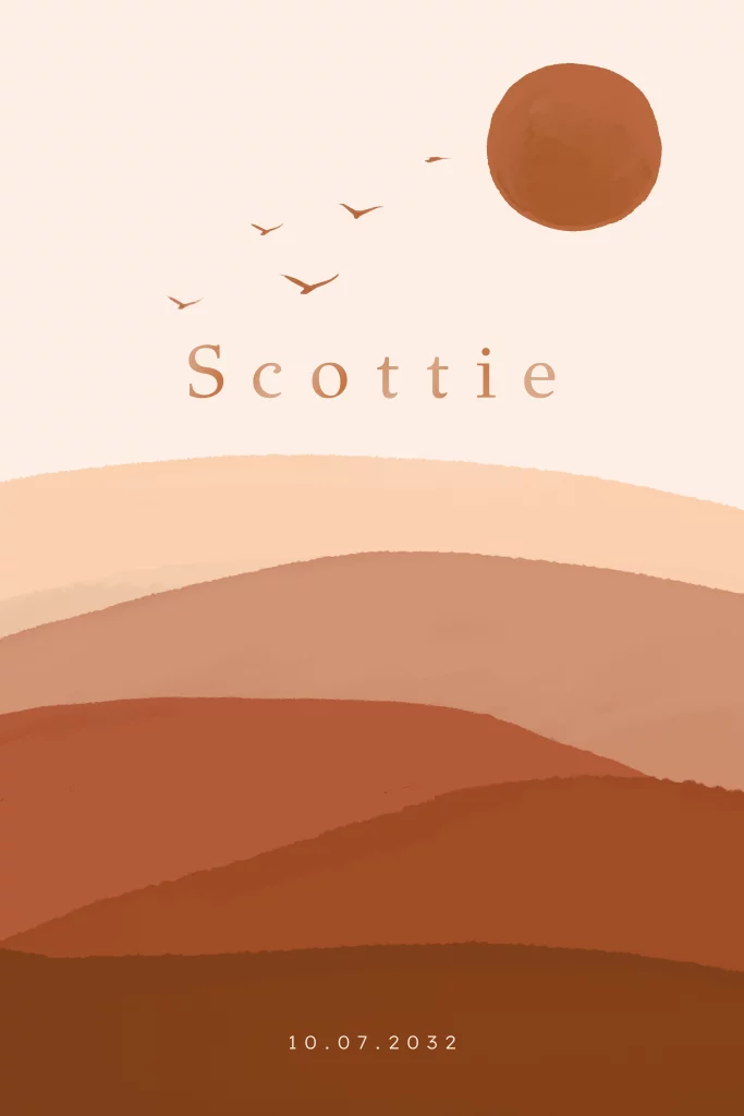 Prachtige geboortekaartje staand enkel meisje landschap met vogels in prachtige aardetinten. Deze kaart is perfect voor een eerste kindje. Het is ook een trendy en natuurlijke keuze voor een zonnige zomer.