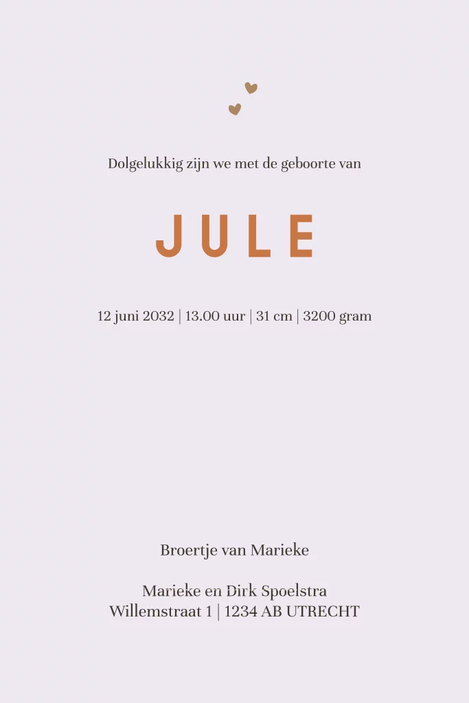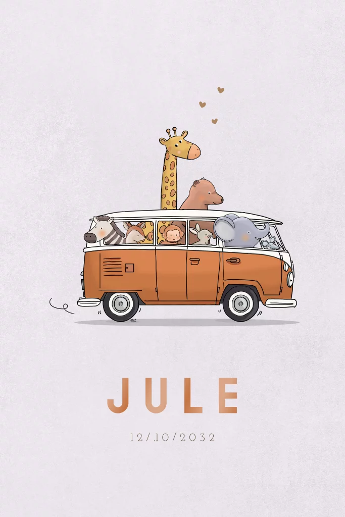 Geboortekaartje volkswagenbusje met dieren zoals een olifant, giraf, muis, zebra, beer, konijn, aap en hertje. De achtergrond kleur is naar wens aanpasbaar. Mooie doorlopende binnenkant met dieren die in het busje zitten. Volkswagenbusjes zijn al lang een geliefd motief op geboortekaartjes. Dit busje met schattige dieren is een schitterend voorbeeld van een origineel en leuk geboortekaartje. Het design is uniek en de kleur oranje maakt het busje echt opvallen. Het geboortekaartje is ook voorzien van een koperfolie accent, wat het geheel een luxe uitstraling geeft.