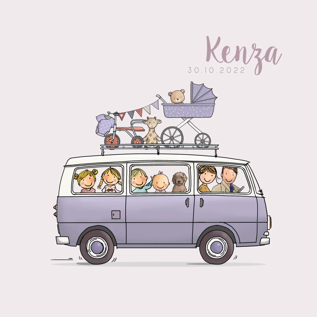 Geboortekaartje busje lila met vier kinderen en ouders. Wat een vrolijke kaart met aanpasbare teksten. Je kunt deze kaart zelf naar wens samenstellen. Veel plezier ermee.