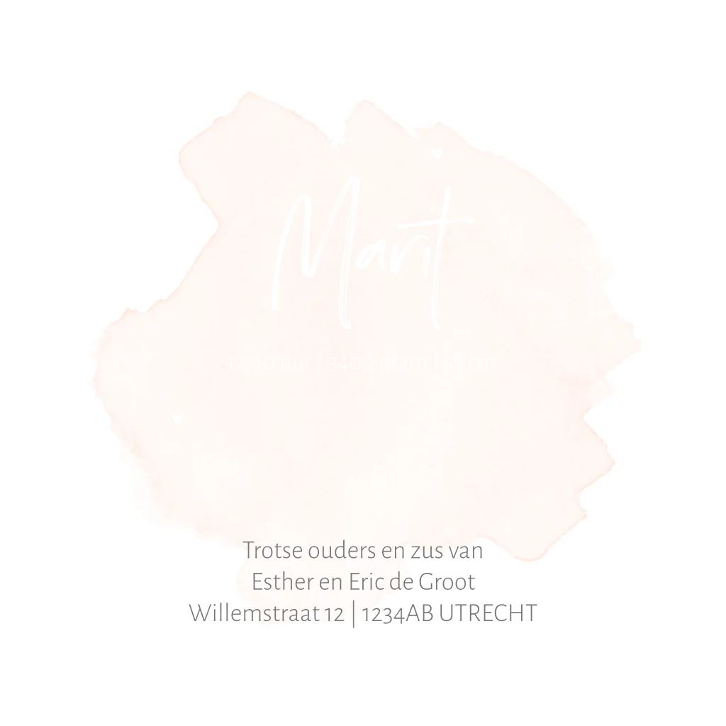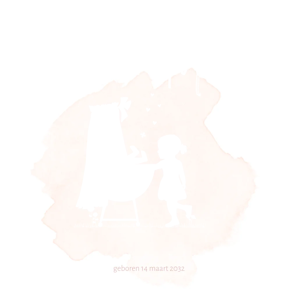 Prachtig geboortekaartje baby meisje voetjes in wieg, zusje staat erbij met hartjes en klavertje vier eromheen. Mooie watercolor achtergrond tint.