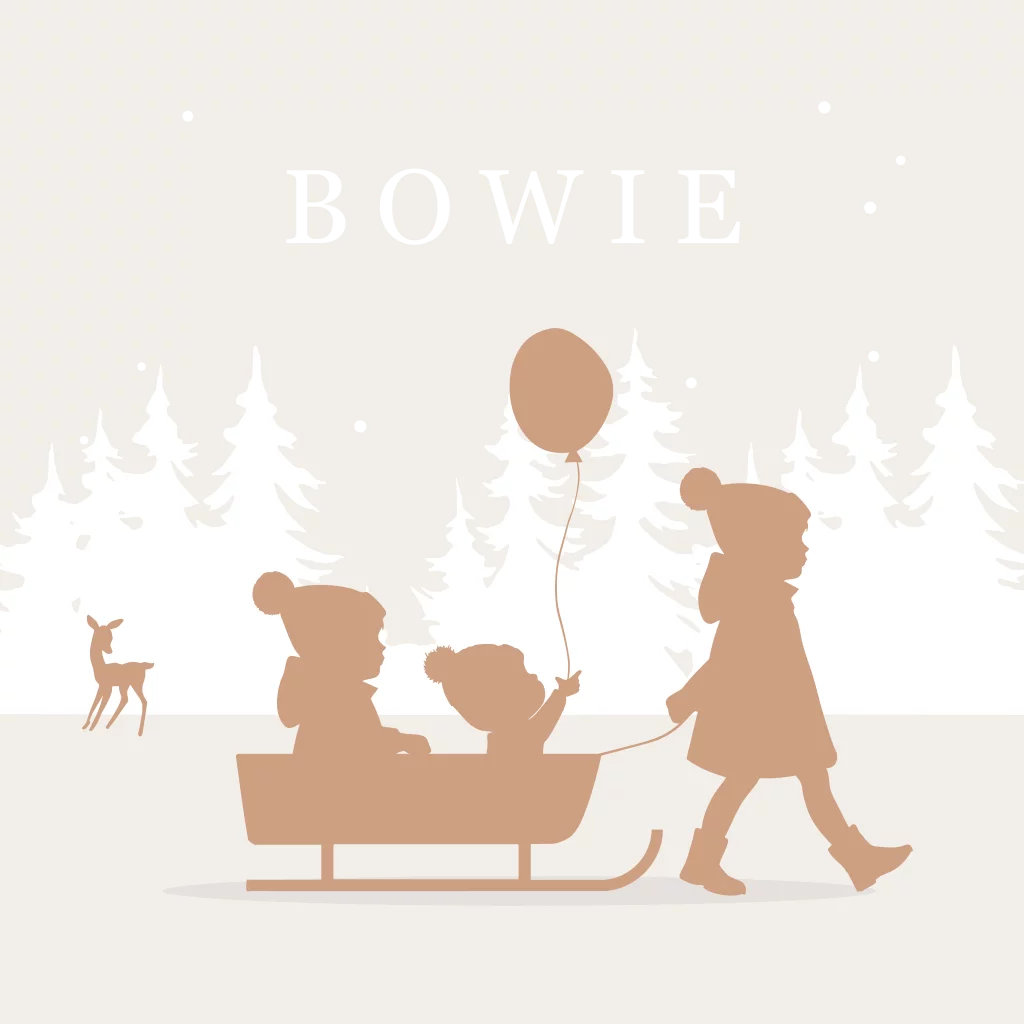 Welkom bij onze collectie geboortekaartjes voor winter baby meisje! Dit prachtige kaartje toont een lief tafereel van een baby meisje in een sierlijke slee, vergezeld door haar zusjes en een speelse ballon. De achtergrond toont een betoverend winterlandschap met een schattig hertje.