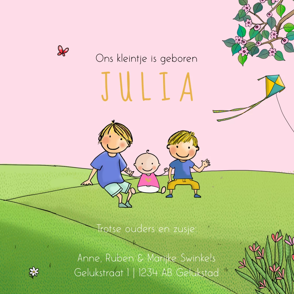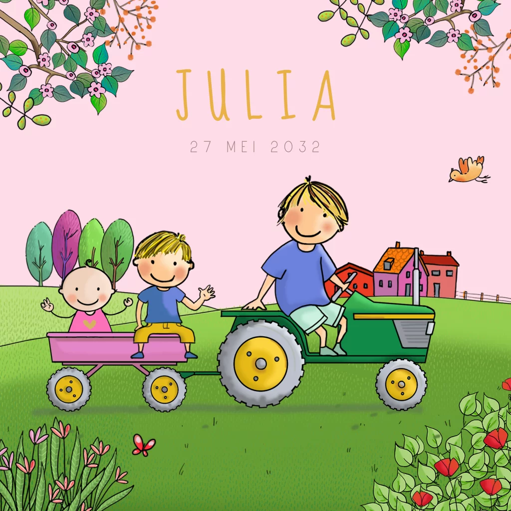Kleurrijk geboortekaartje met stoere tractor groen met roze aanhangwagen, broer rijdt de trekker en broertje met baby meisje zit in de roze aanhanger.