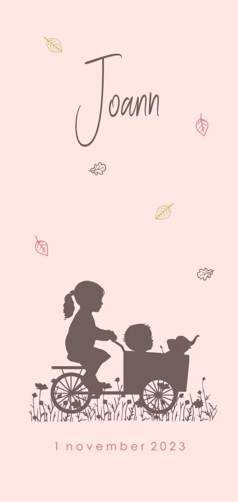 Geboortekaartje silhouet zusje bakfiets met baby meisje herfst