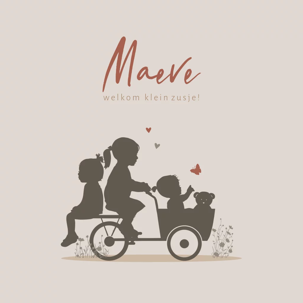 Geboortekaartje silhouet grote zus fietsend op bakfiets met zusje achterop en baby meisje met knuffel beer. Een mooie vlinder en hartjes maken het helemaal af.
