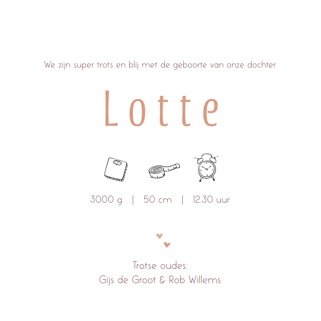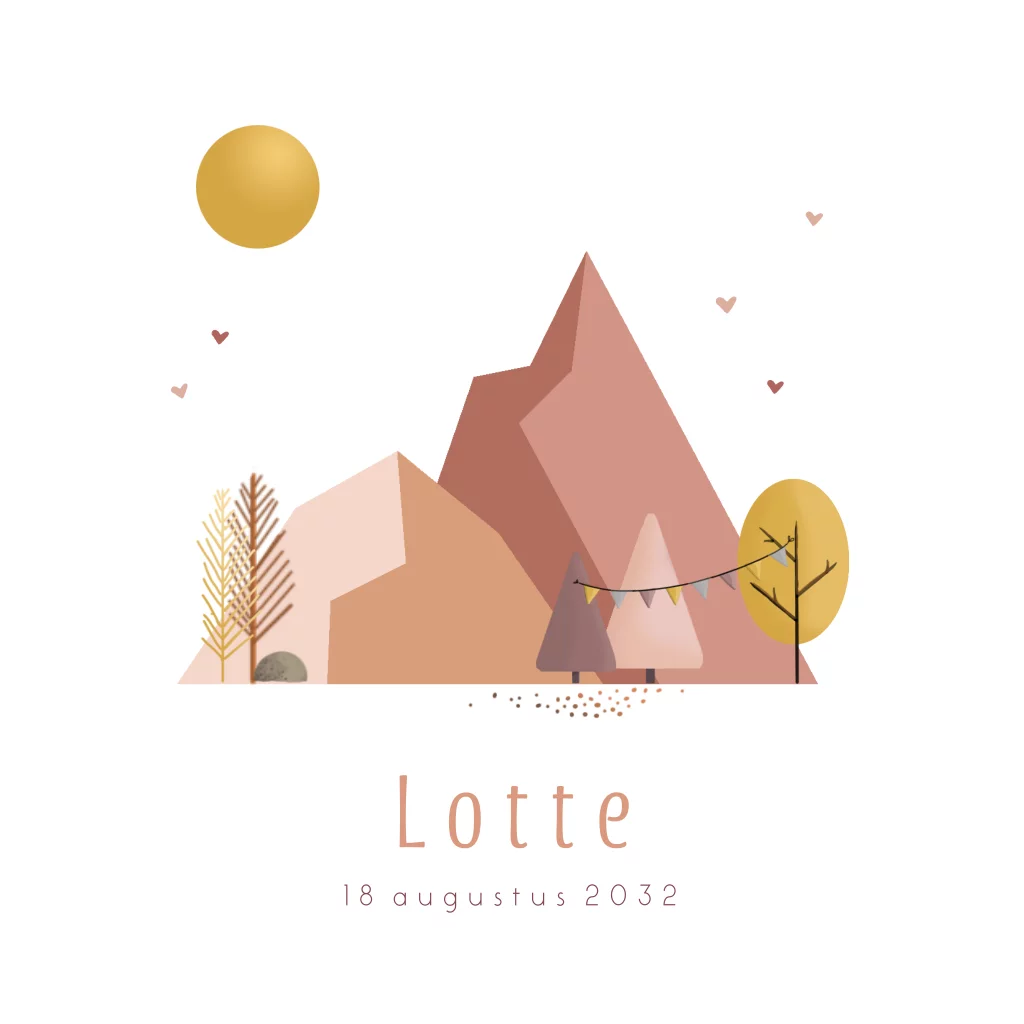 Prachtig geboortekaartje met bergen in mooie roze tinten en een gele zon met hartjes.