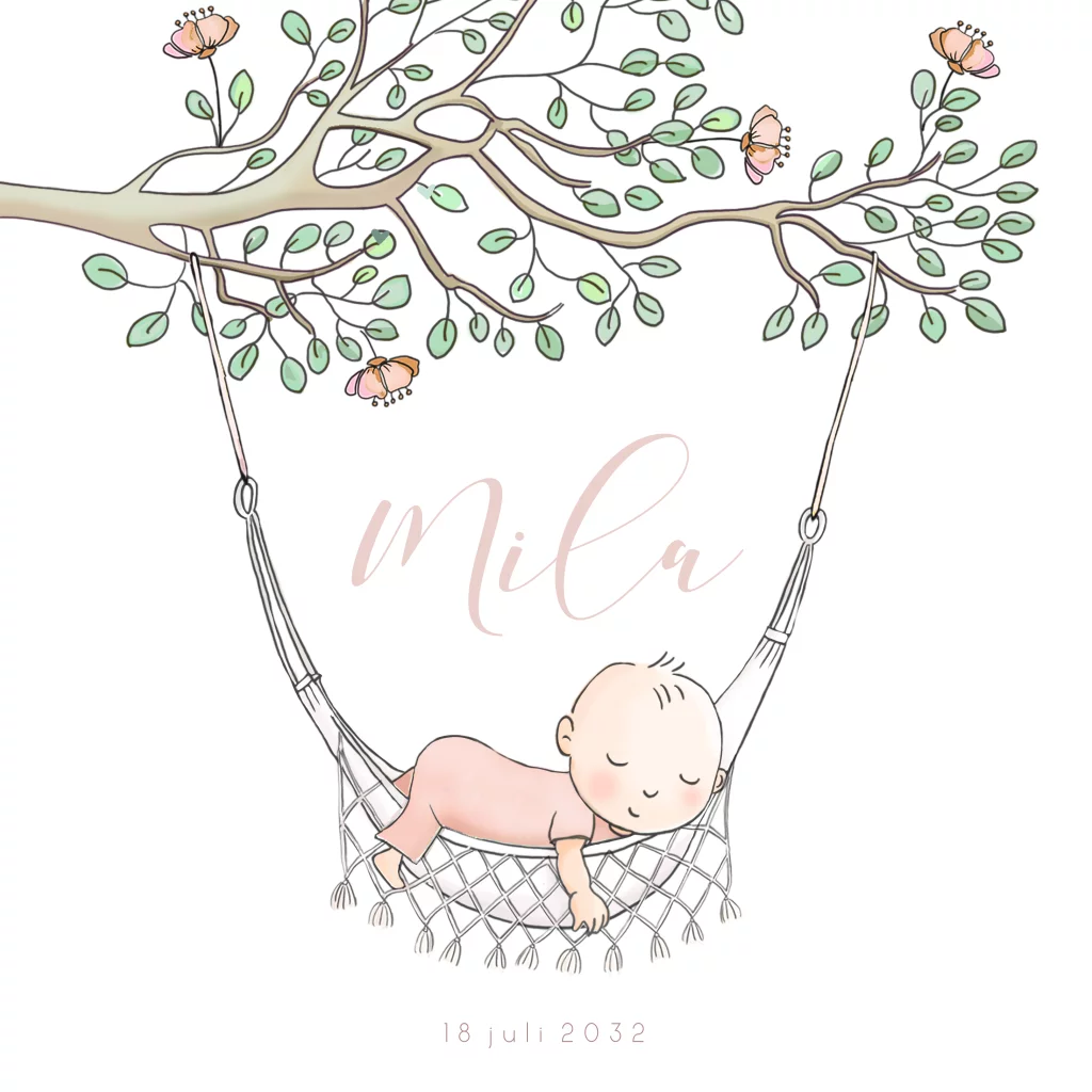 Lief meisje in een mooie hangmat met boomtak met bloemen. Het kindje ligt lief te slapen.