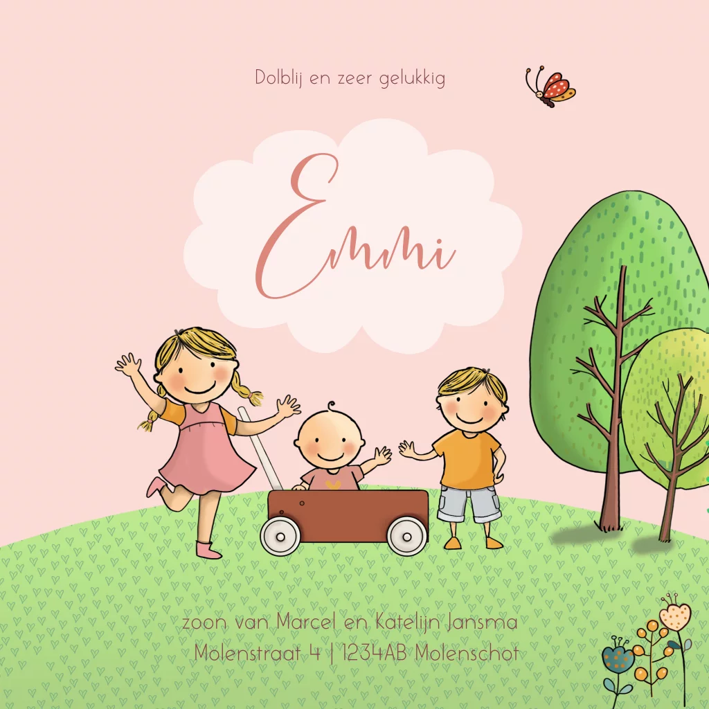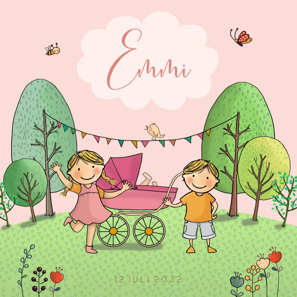 Geboortekaartjes meisje kinderwagen broertje en zus met bomen