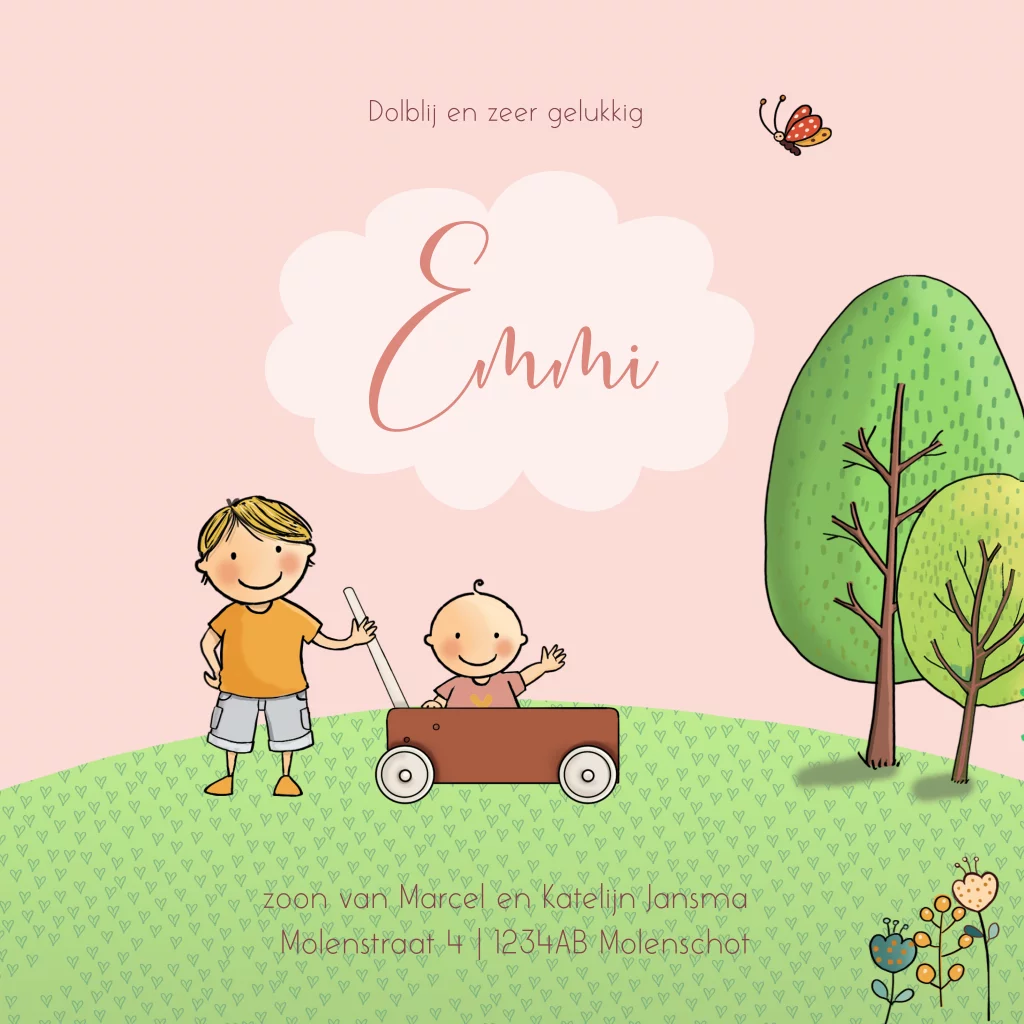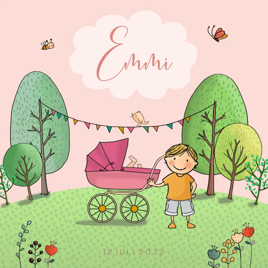 Geboortekaartjes meisje kinderwagen broertje met bomen