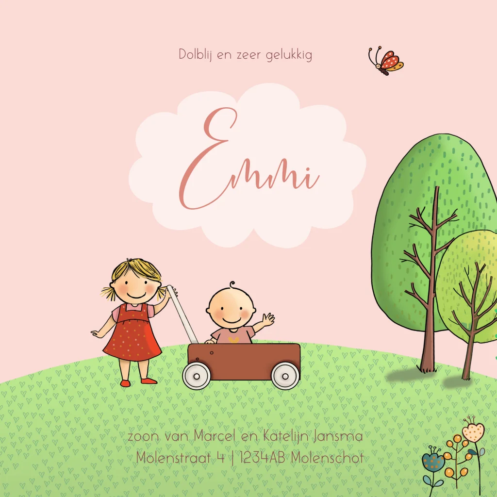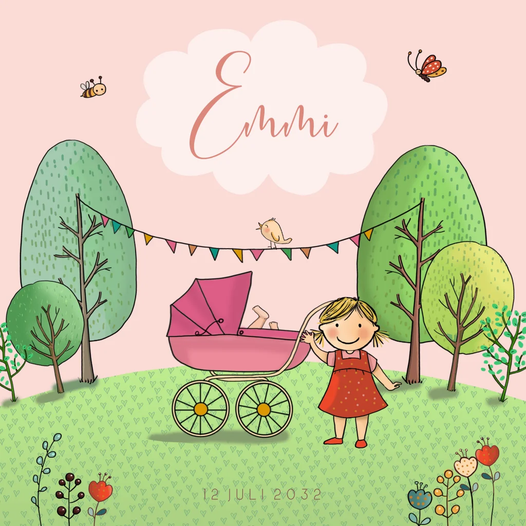 Geboortekaartjes meisje kinderwagen zusje met bomen