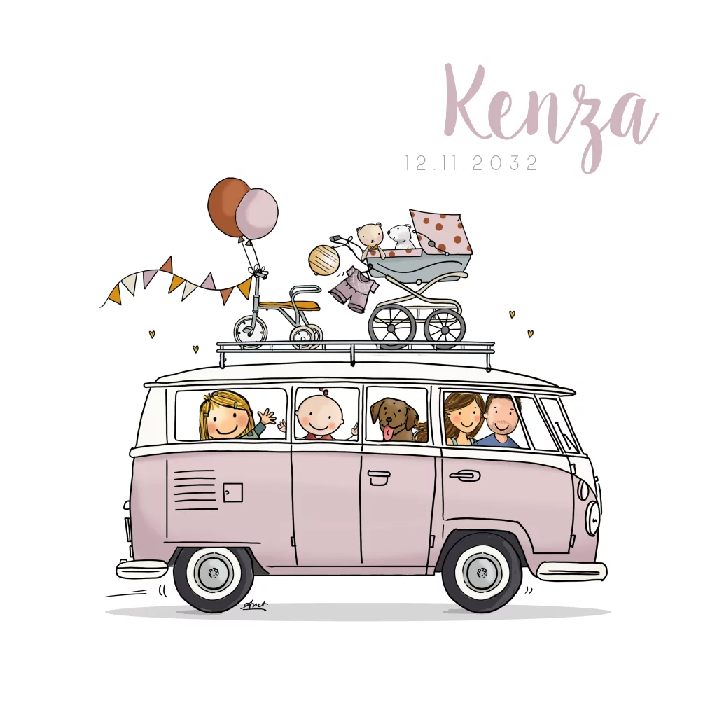 Geboortekaartje baby meisje in lila volkswagen busje roze met ouders en zusje met hond. De afbeeldingen je vervangen uit de clipart, zelf samenstellen naar wens, veel plezier met het ontwerpen.