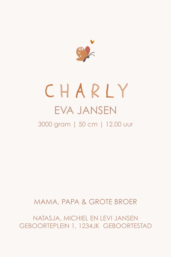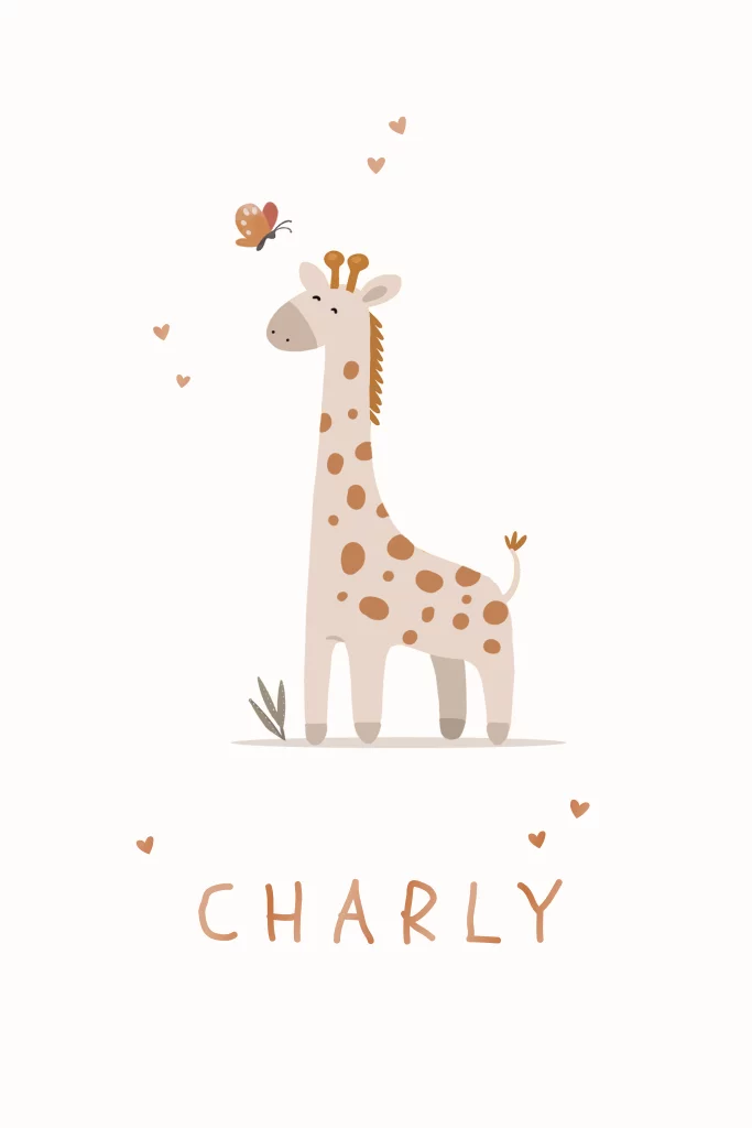 Is er net een kleine giraf geboren? Dan is dit neutrale geboortekaartje met vlinder perfect! Het kaartje is getekend en heeft een hartje van koper of brons foliedruk. Een leuk kaartje voor een unisex baby, maar ook perfect voor een meisje of jongen.