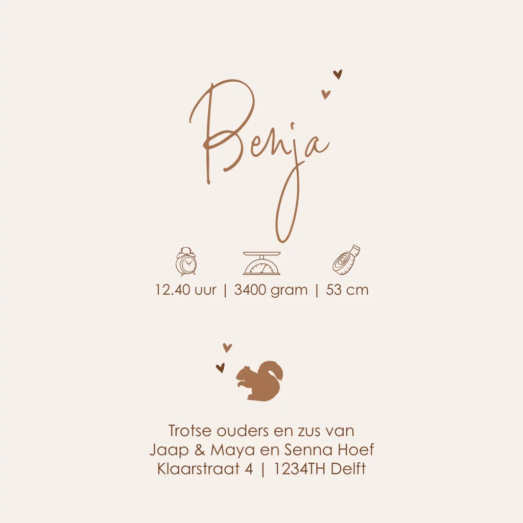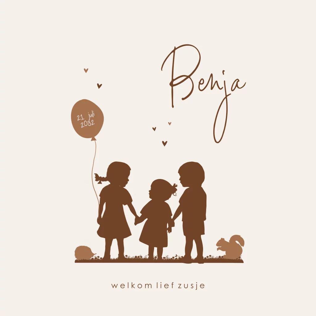 Silhouet geboortekaartje meisje met zusje en broertje, ballon en lieve eekhoorn en egeltje maken het een mooi lief kaartje.
