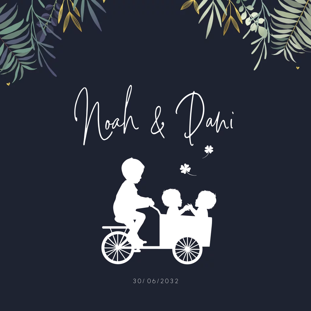Geboortekaartje tweeling in kruiwagen met broertje.