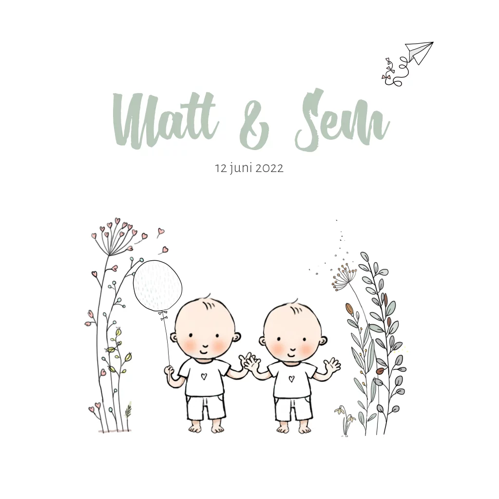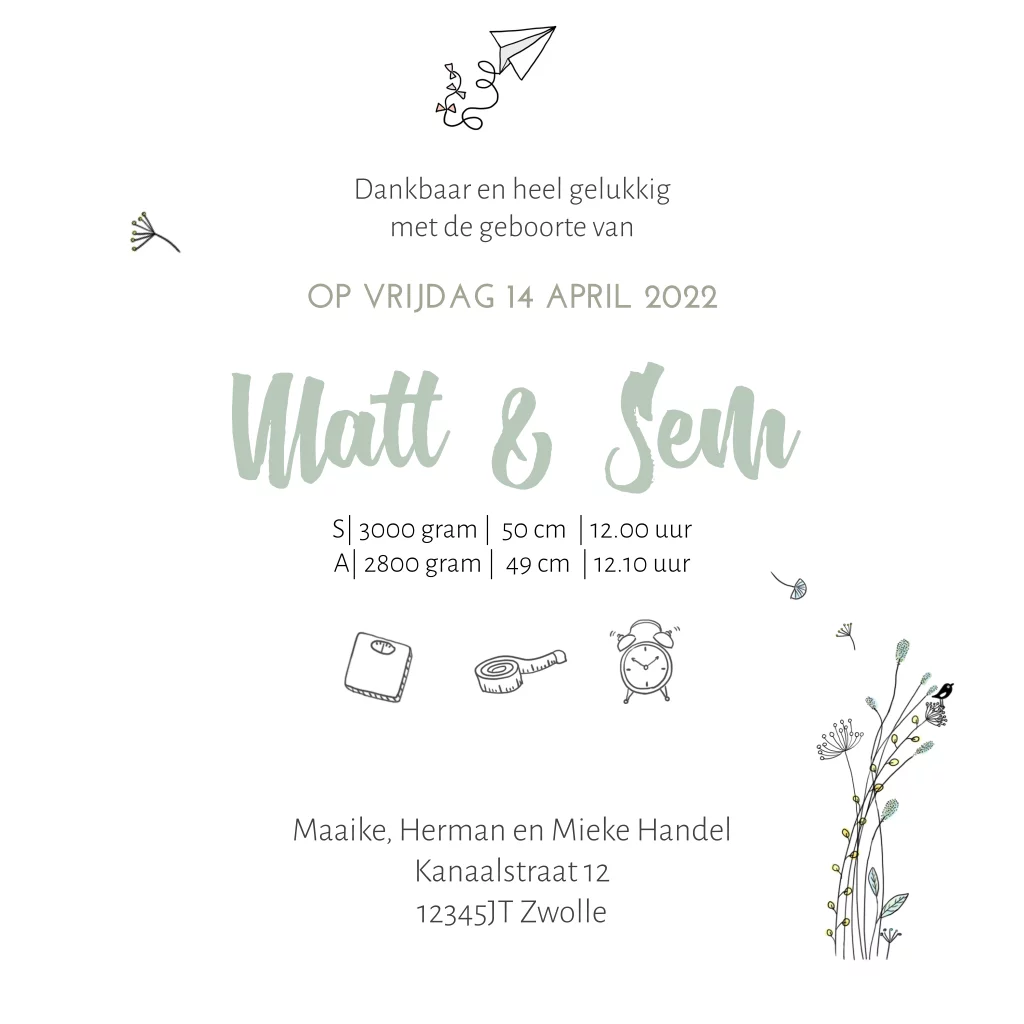 Geboortekaartje tweeling jongen met takjes, mooie pentekening met twee jongens baby's