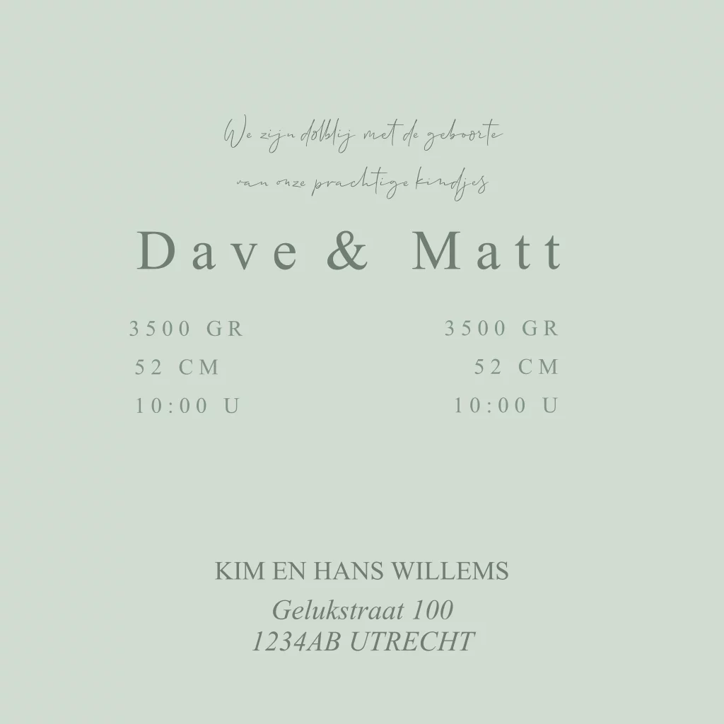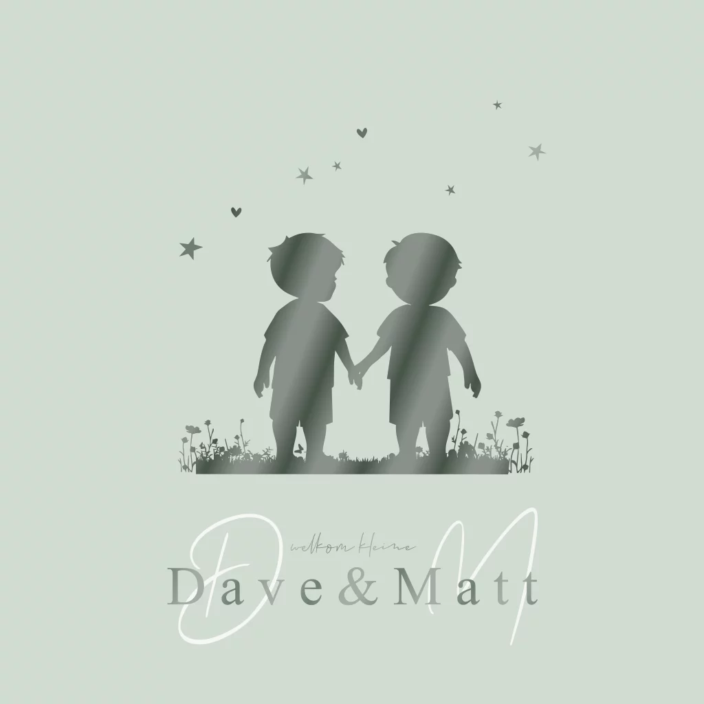 Geboortekaartje tweeling jongens in gras met hartjes, prachtig kaartje met geheel aanpasbare teksten.