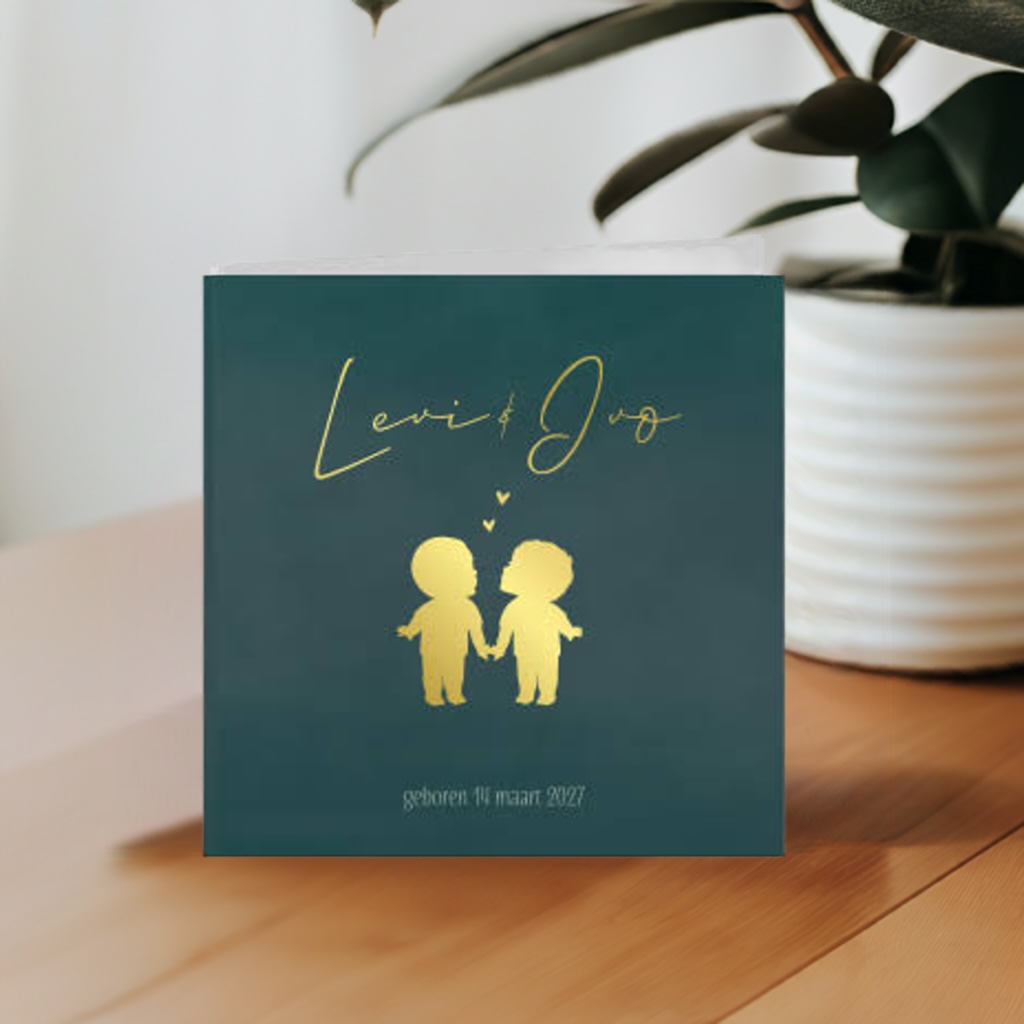 Geboortekaartje tweeling kusje en hartjes met prachtige warm donker groene achtergrond