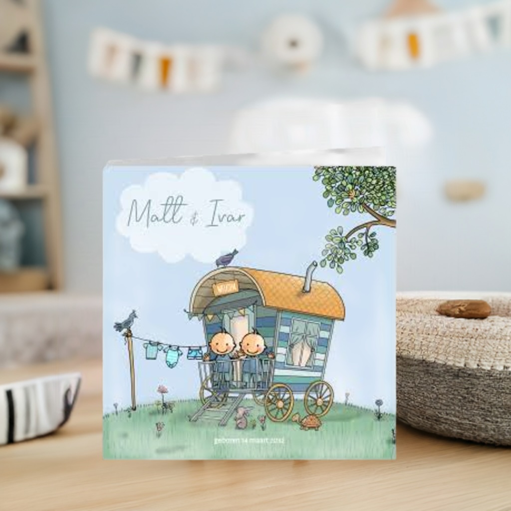 Geboortekaartje tweeling jongens pipowagen met vlaggetjes, mooie achtergrond in blauw en groen gras. Teksten zijn naar wens aanpasbaar.
