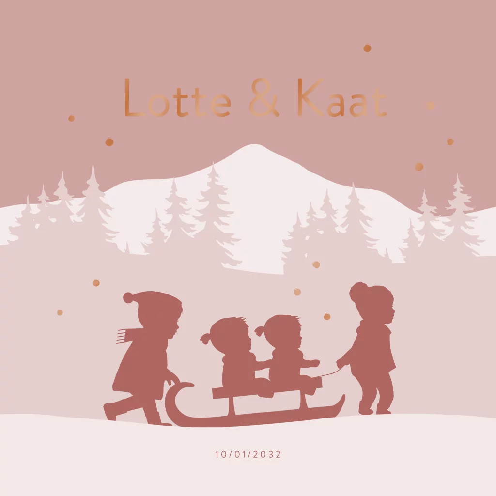 Geboortekaartje tweeling meisje op slee met zusjes landschap