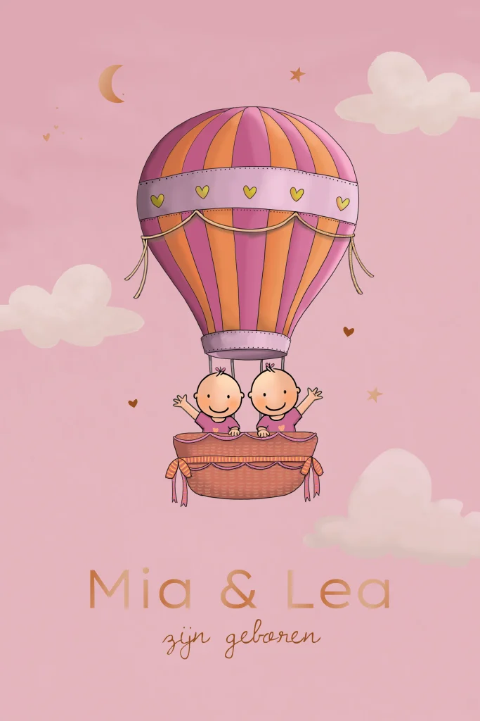 Geboortekaartje tweeling meisjes in ballon roze