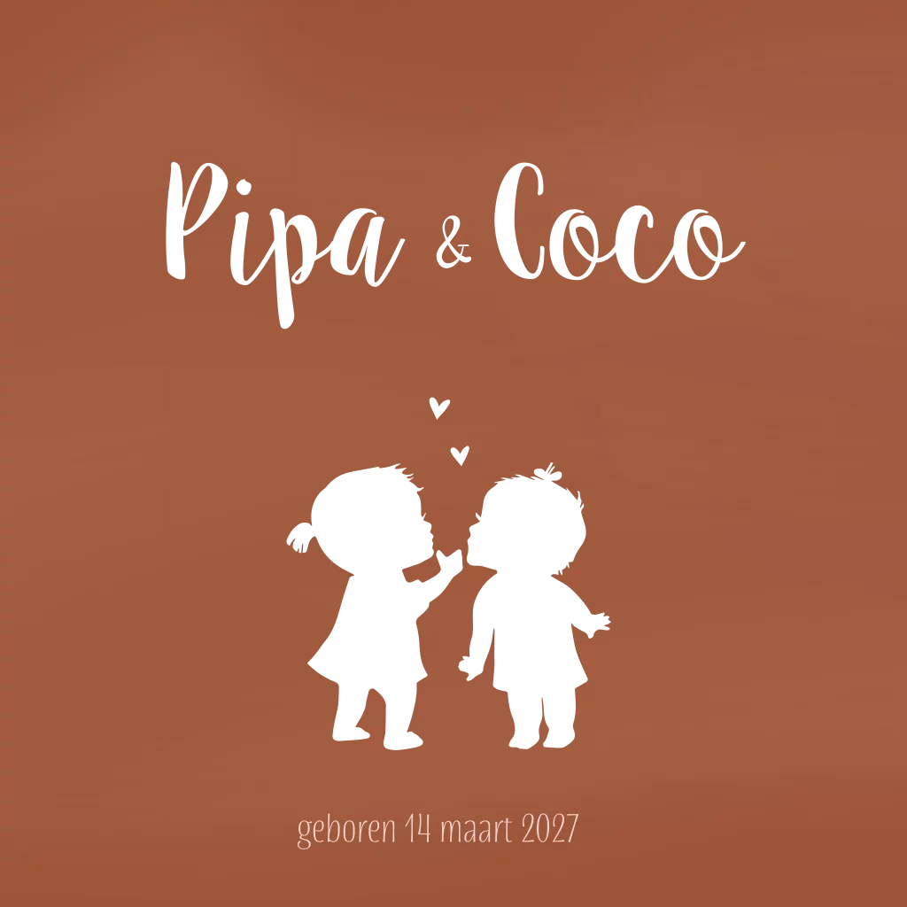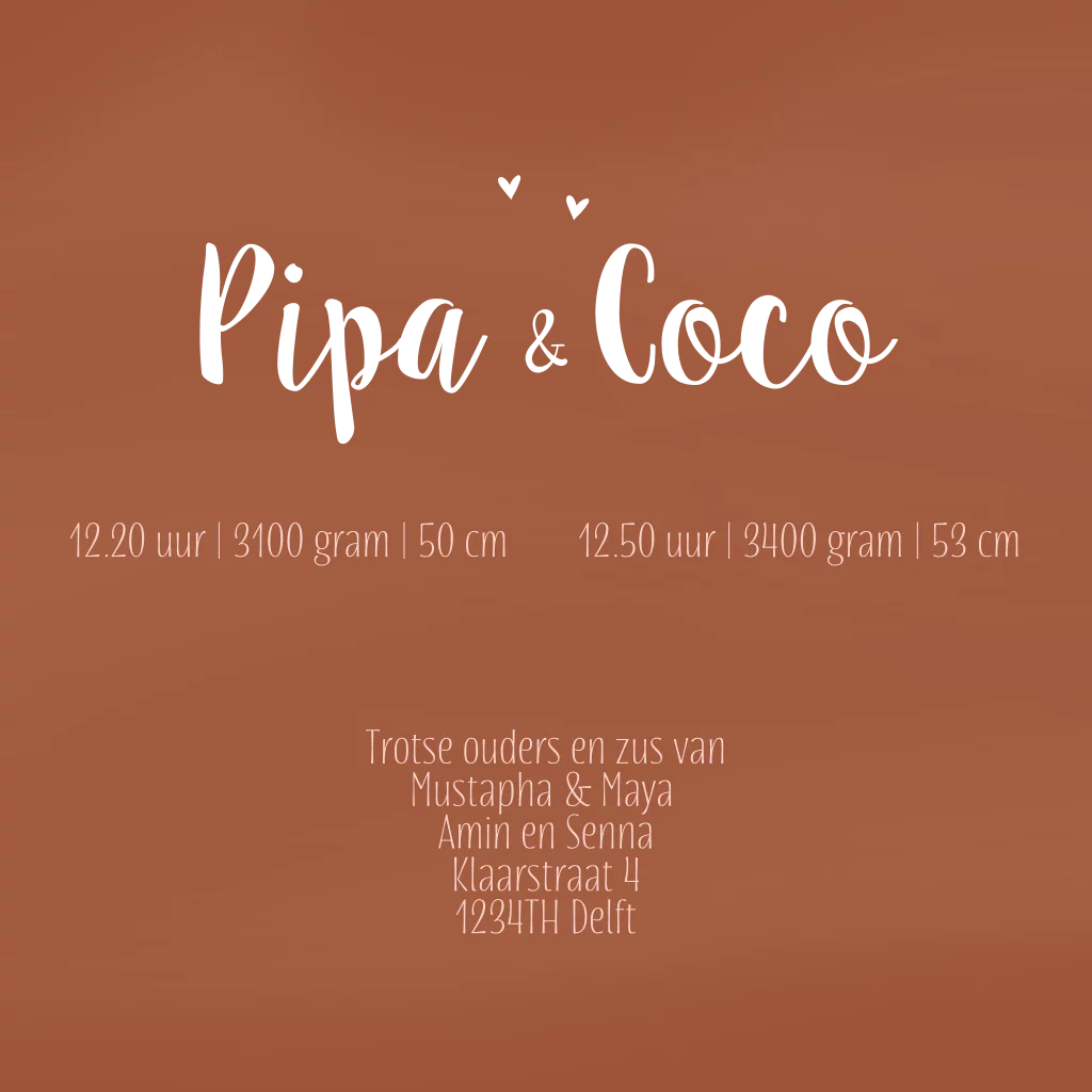 Geboortekaartje tweeling meisjes hartje bruinrode achtergrond