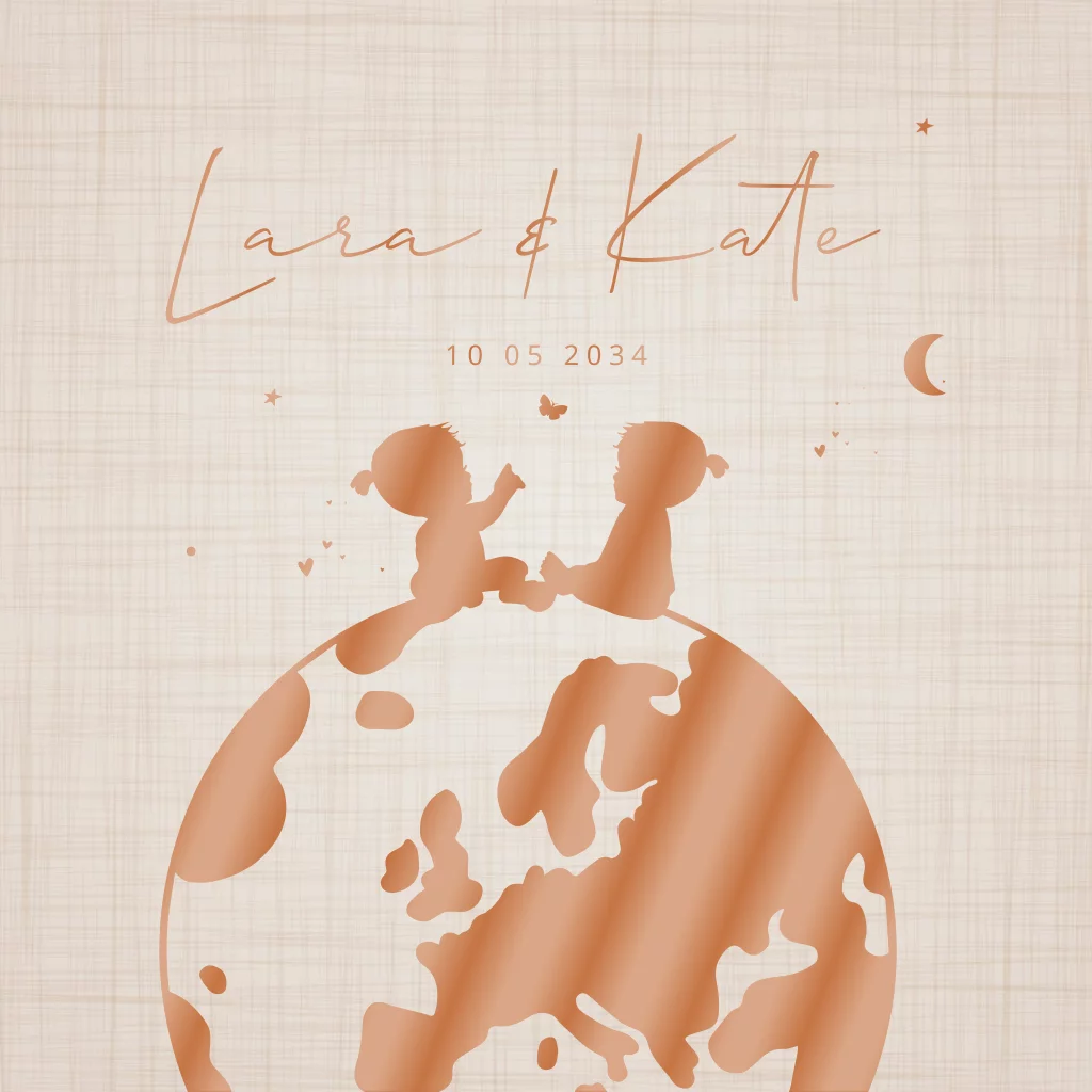 Geboortekaartje tweeling meisjes op wereldbol beige