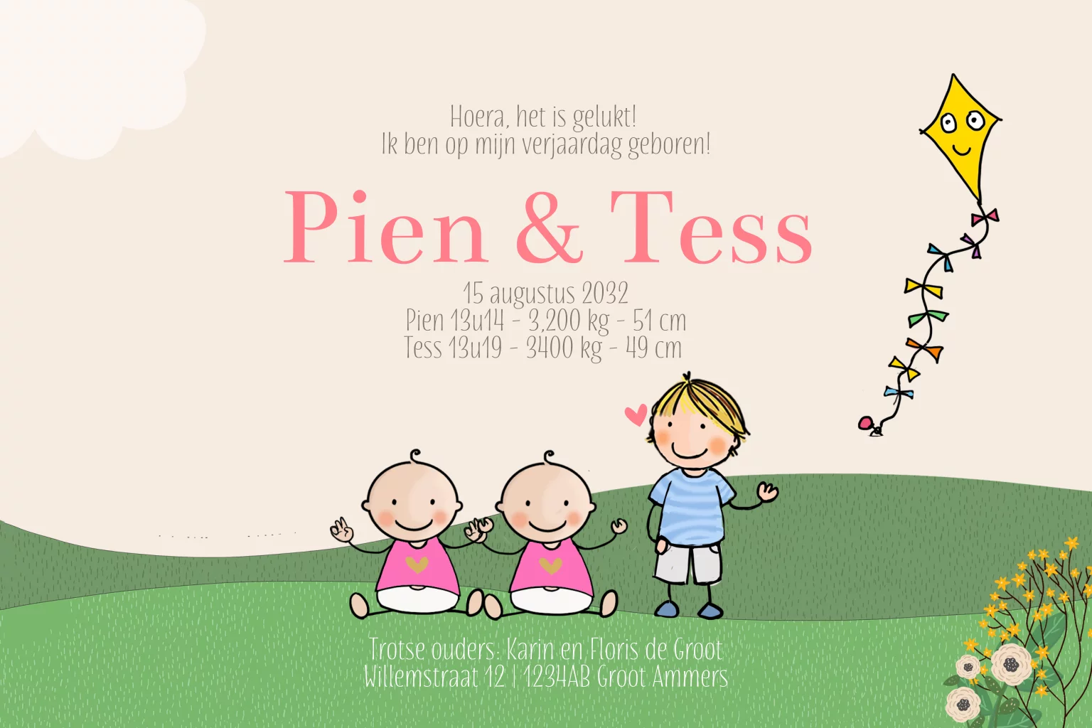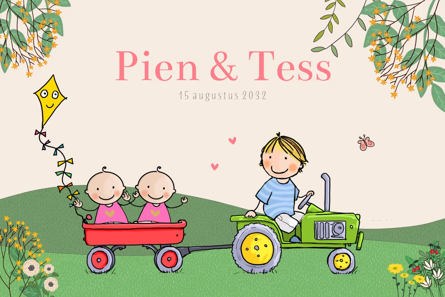 Geboortekaartje van een tweeling meisjes in een aanhanger. Broer rijdt op de tractor. Kleurrijke achtergrond met bloemen en takjes.