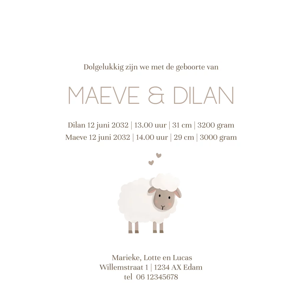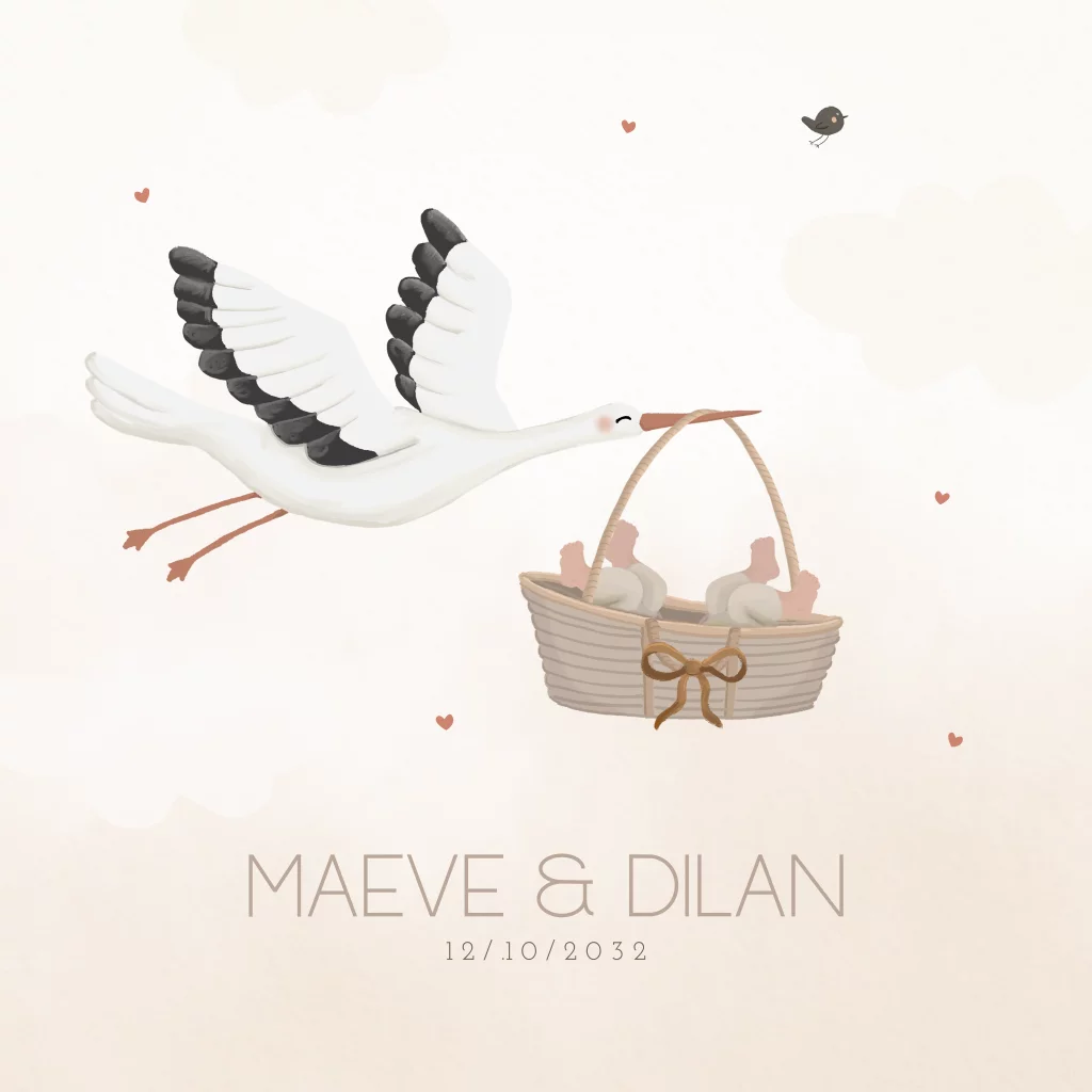 Geboortekaartje tweeling ooievaar met baby in mand