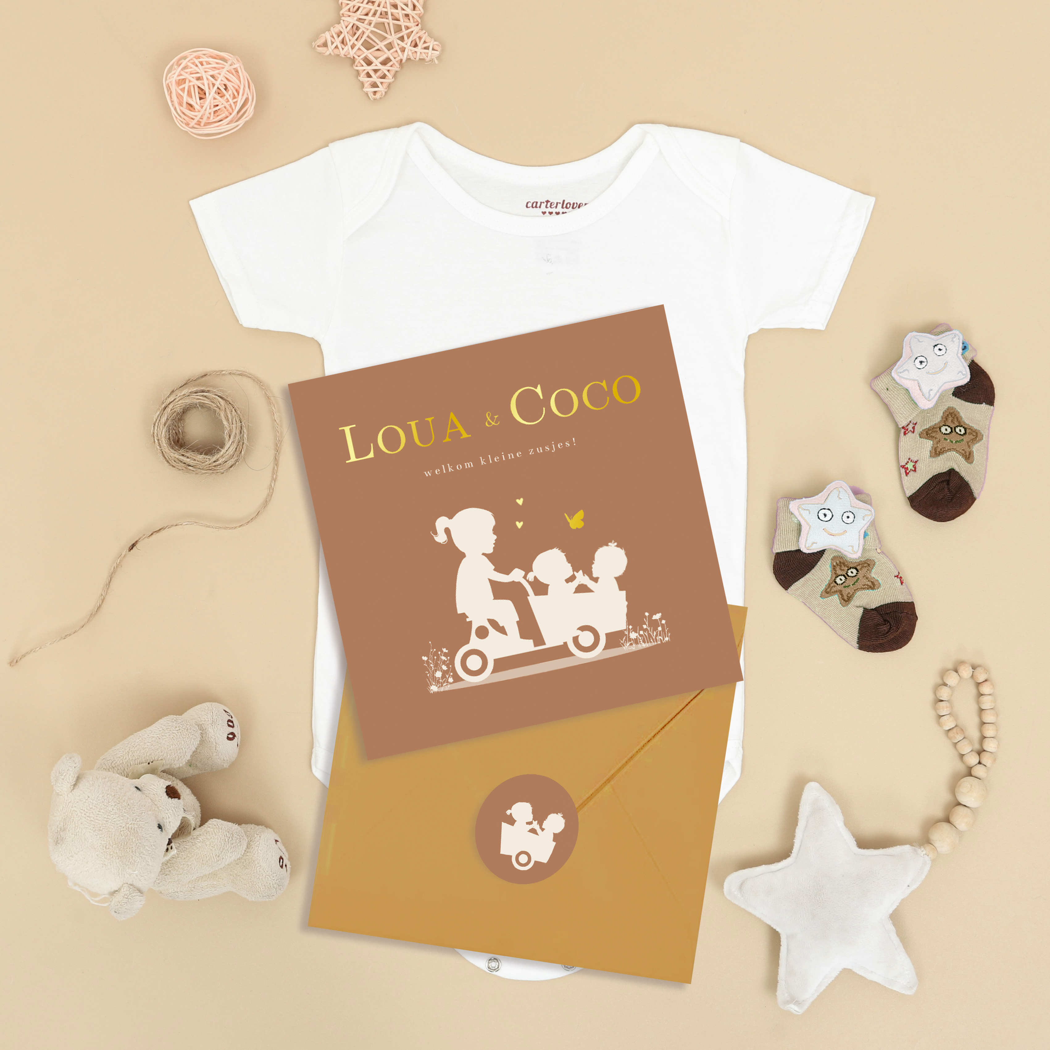 Geboortekaartje tweeling meisjes met mooie terra cotta achtergrond, zusje fiets in haar bakfiets met baby zusje. Lieve beer knuffel en vlinder en hartjes