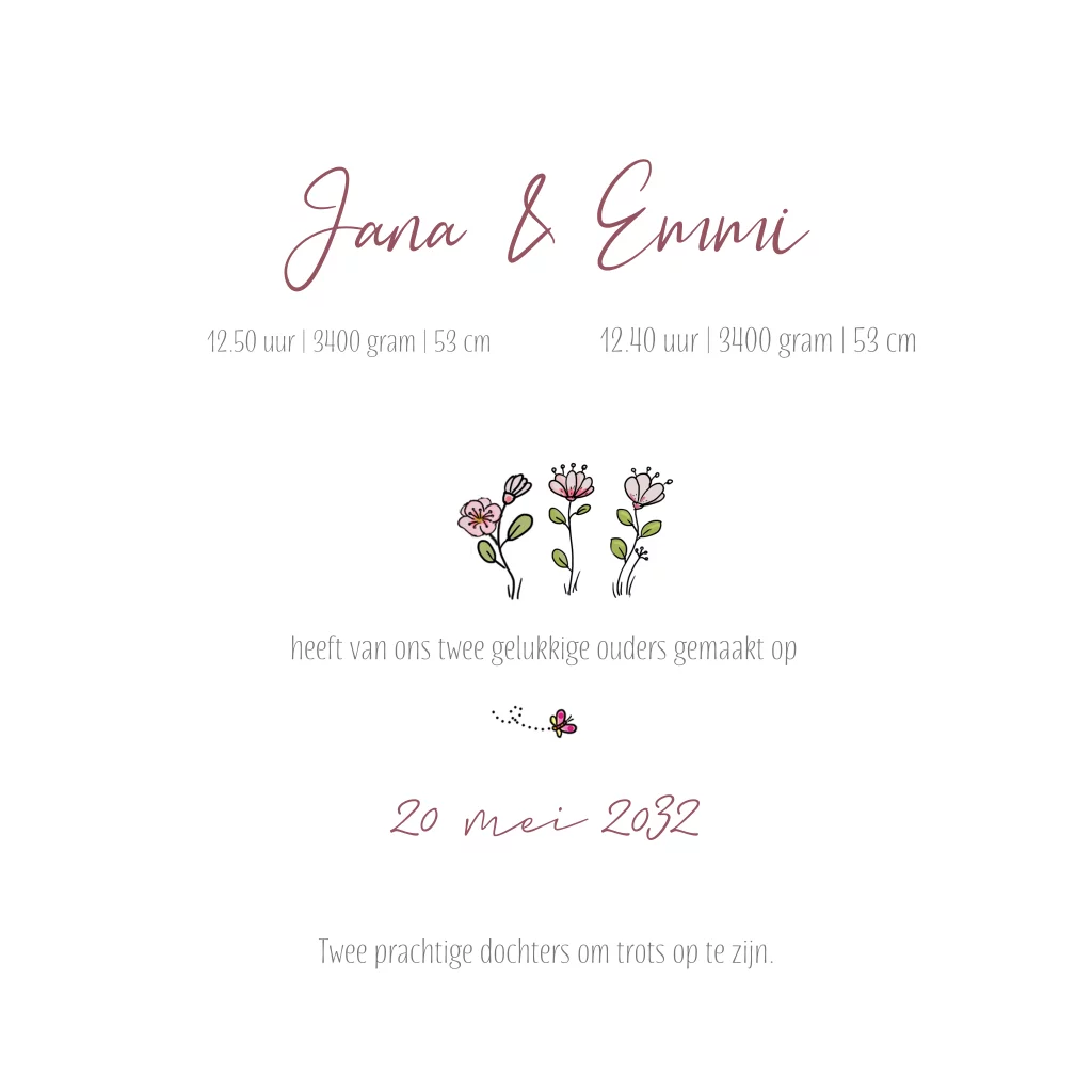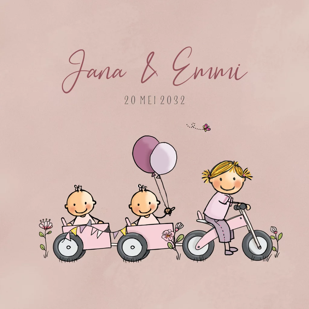 Geboortekaartje tweeling meisjes in karretjes met loopfiets zusje. Bloemen, ballonnen en vlinder als losse elementen.