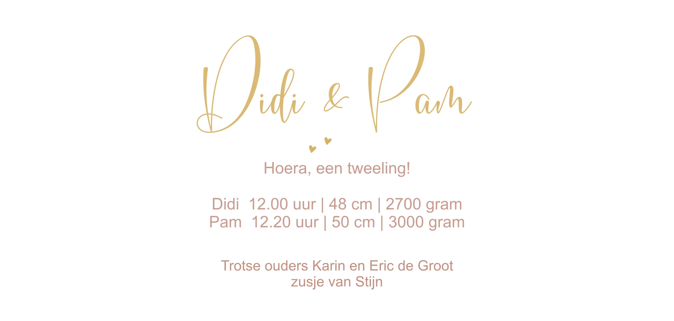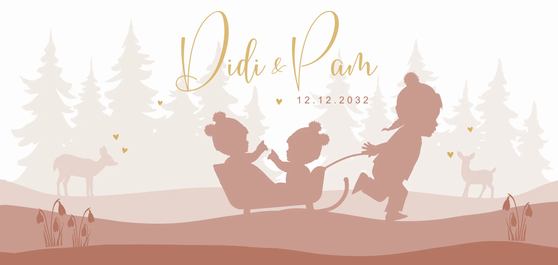 Langwerpige geboortekaart met tweeling in slee, zusje trekt de slee, prachtige winter achtergrond met landschap. Dit kaartje is makkelijk aan te passen met afbeeldingen uit de clipart.