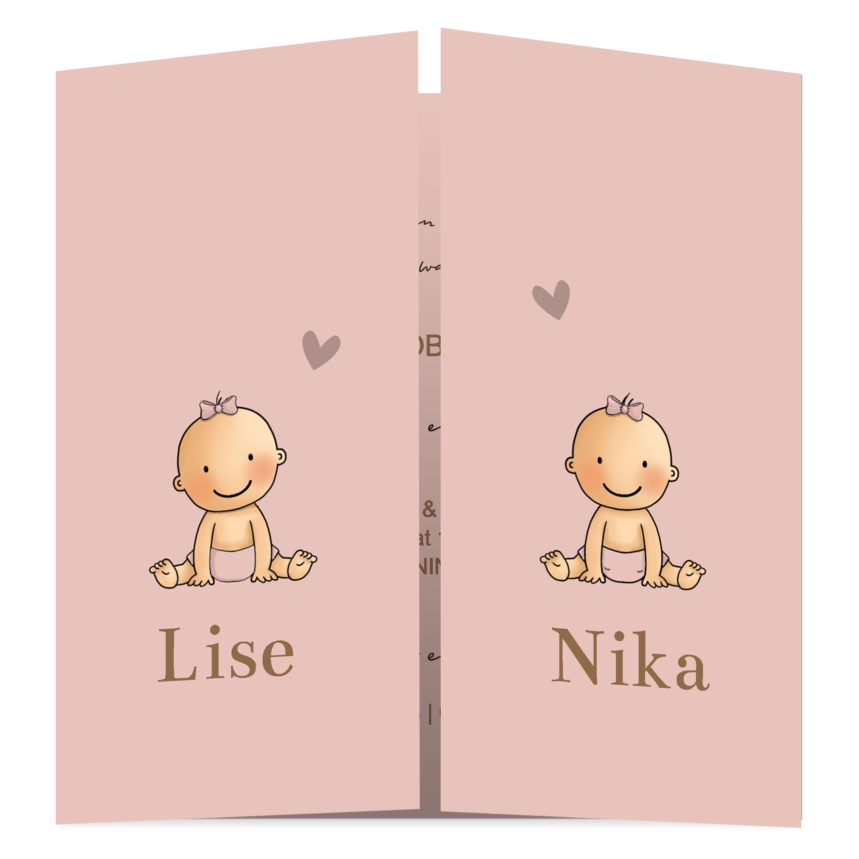 Een prachtig tweeling geboortekaartje van twee lieve meisjes met strikjes.Kaartje Lise en Nika is een luikkaartje. Dit betekent dat het kaartje vanuit het midden opengaat. Zo heeft ieder kindje zijn eigen zijde van de kaart. Maar als je het kaartje weer dichtklapt zijn ze weer samen één geheel.