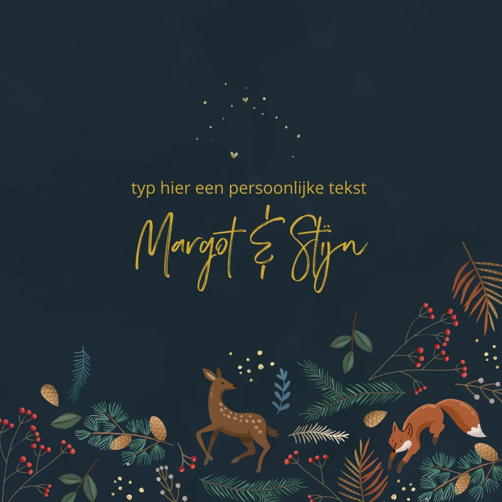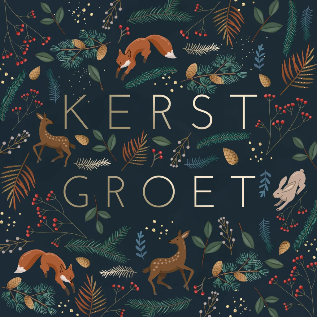 Kerstkaart donker bosdieren en takjes